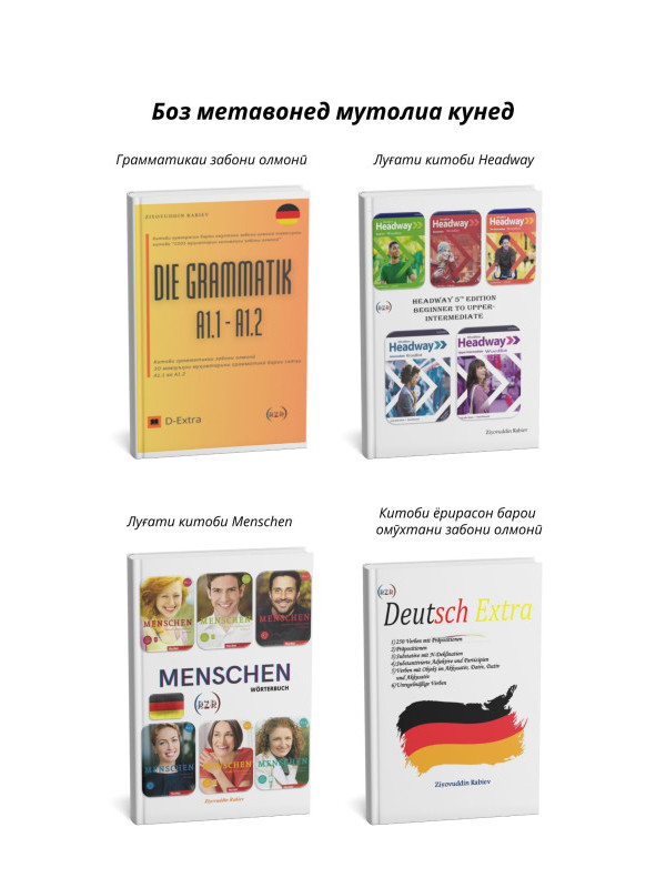 Ин китоб барои донишҷӯён, сайёҳон ва ҳар касе, ки забони олмониро аз сифр аз худ кардан мехоҳад, ёрдамчии зарурӣ хоҳад шуд. Саёҳати худро ба ҷаҳони олмонӣ бо мо оғоз кунед!