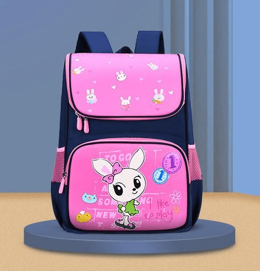 Дизайн: Рюкзак выполнен в темно-синем цвете с розовыми акцентами. На переднем кармане изображен мультяшный белый кролик с розовым бантом и зелёным платьем, а также другие декоративные элементы, такие как значок с цифрой "1" и маленькие мордочки животных. Клапан рюкзака украшен множеством маленьких белых кроликов.