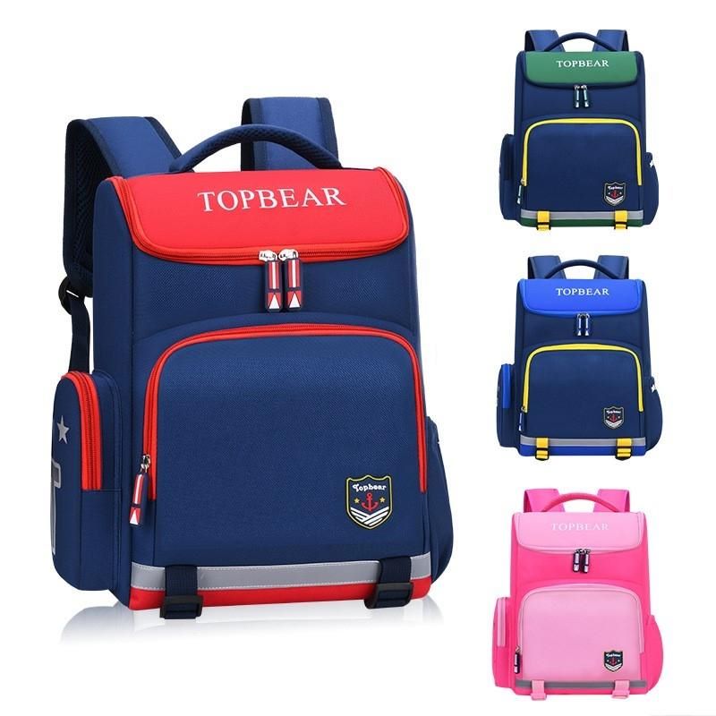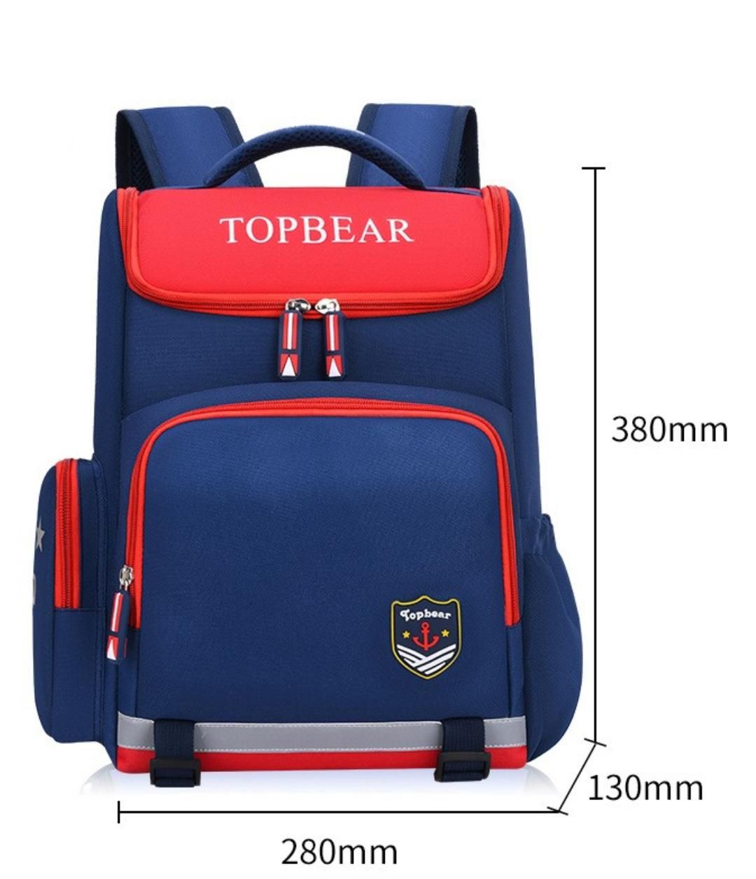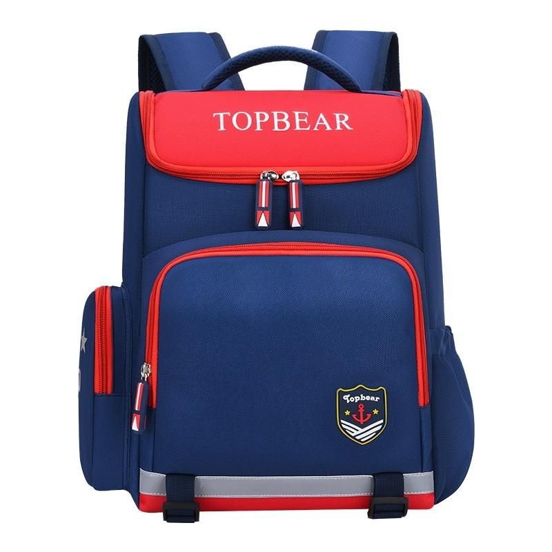 Дизайн: Рюкзак выполнен в синем и красном цветах с эмблемой в виде якоря и надписью "Topbear" на переднем кармане. Застежки-молнии имеют красно-белые полосатые язычки.