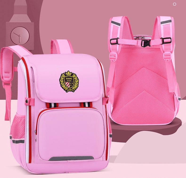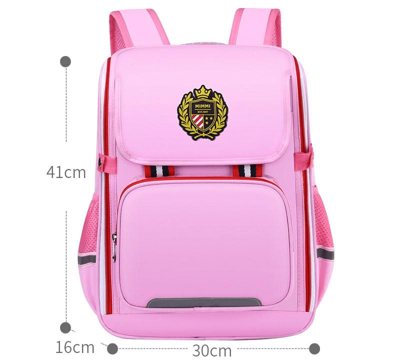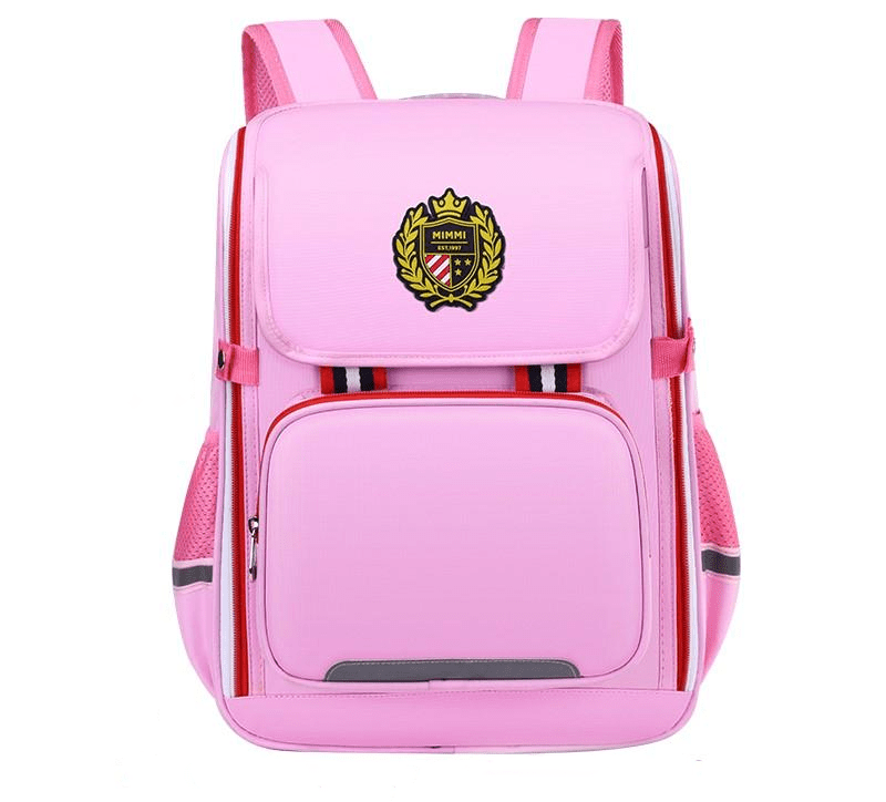 Дизайн: Рюкзак выполнен в розовом цвете с несколькими отделениями. На передней части рюкзака есть декоративный эмблема с короной, лавровыми листьями и щитом с надписью "Mini" и "since 1987". Рюкзак также имеет красные, белые и синие полосатые акценты.