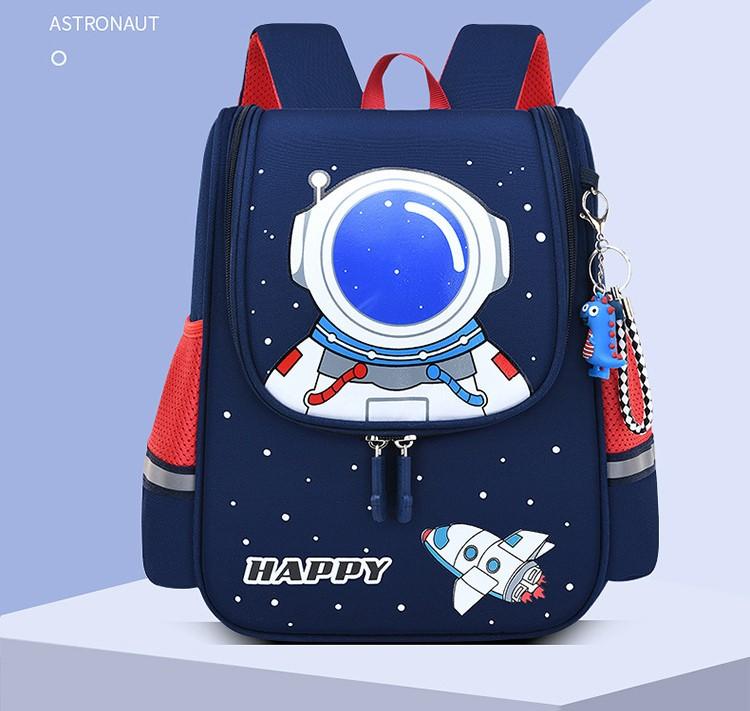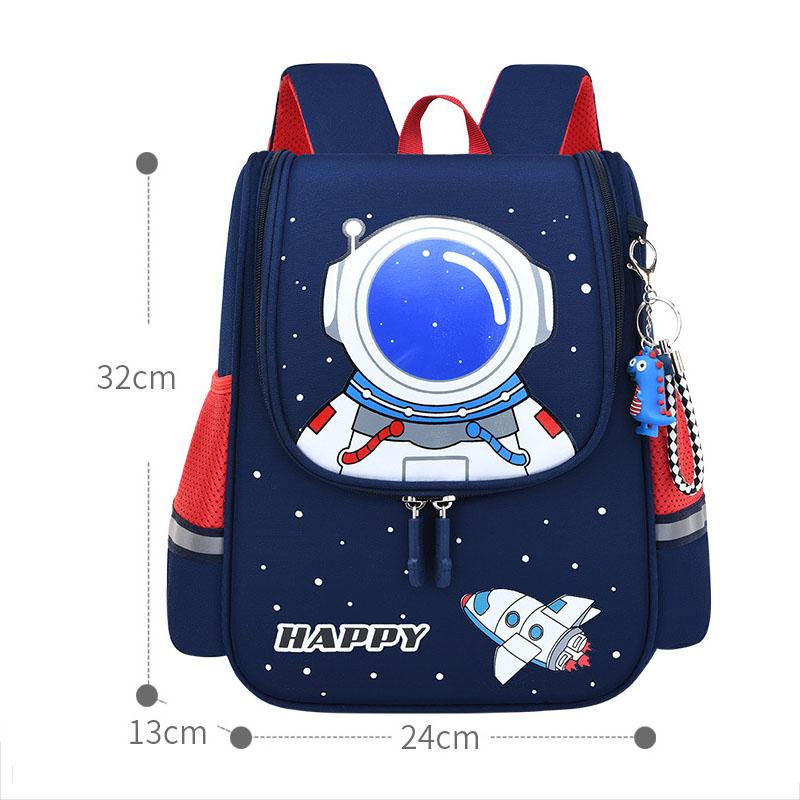 Дизайн: Рюкзак украшен изображением шлема астронавта на верхнем кармане и мультяшного космического корабля с огненным следом на нижнем кармане. Вокруг корабля изображены маленькие звезды.