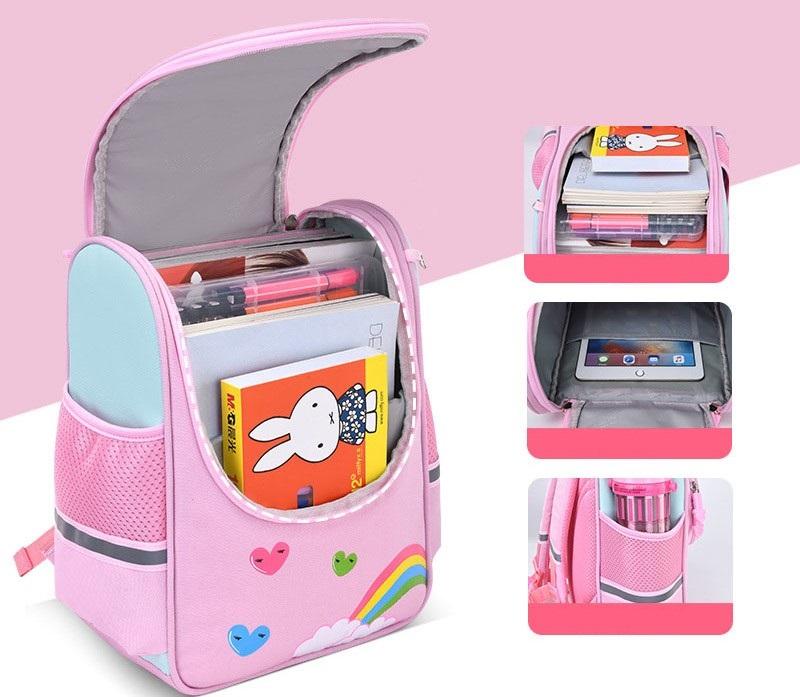 Отделения: Два основных отделения на молнии для книг, игрушек и других необходимых вещей, а также боковые карманы для мелочей.