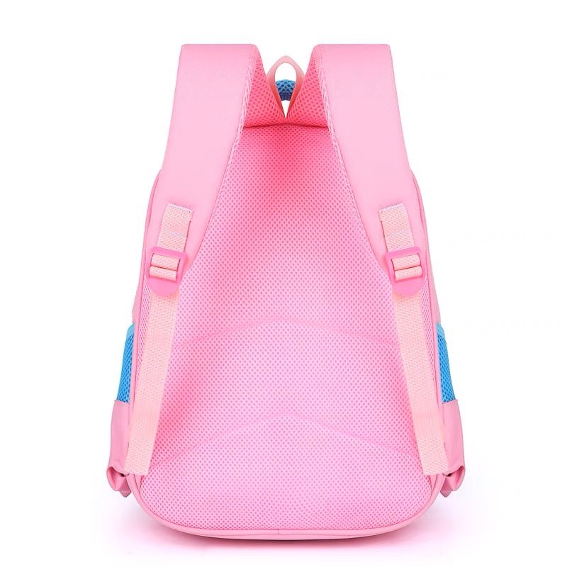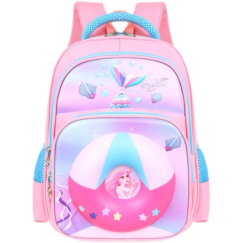 Дизайн: Рюкзак украшен изображением хвоста русалки, ракушек и пляжного мяча с изображением девочки внутри. Основной цвет рюкзака - розовый с голубыми акцентами. Рюкзак имеет два основных отделения на молнии и боковые карманы из сетчатого материала.