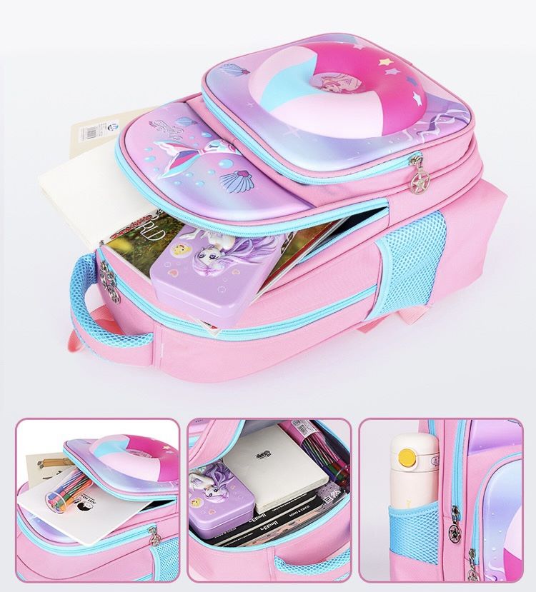 Отделения: Два основных отделения на молнии для книг, игрушек и других необходимых вещей, а также боковые карманы для мелочей.