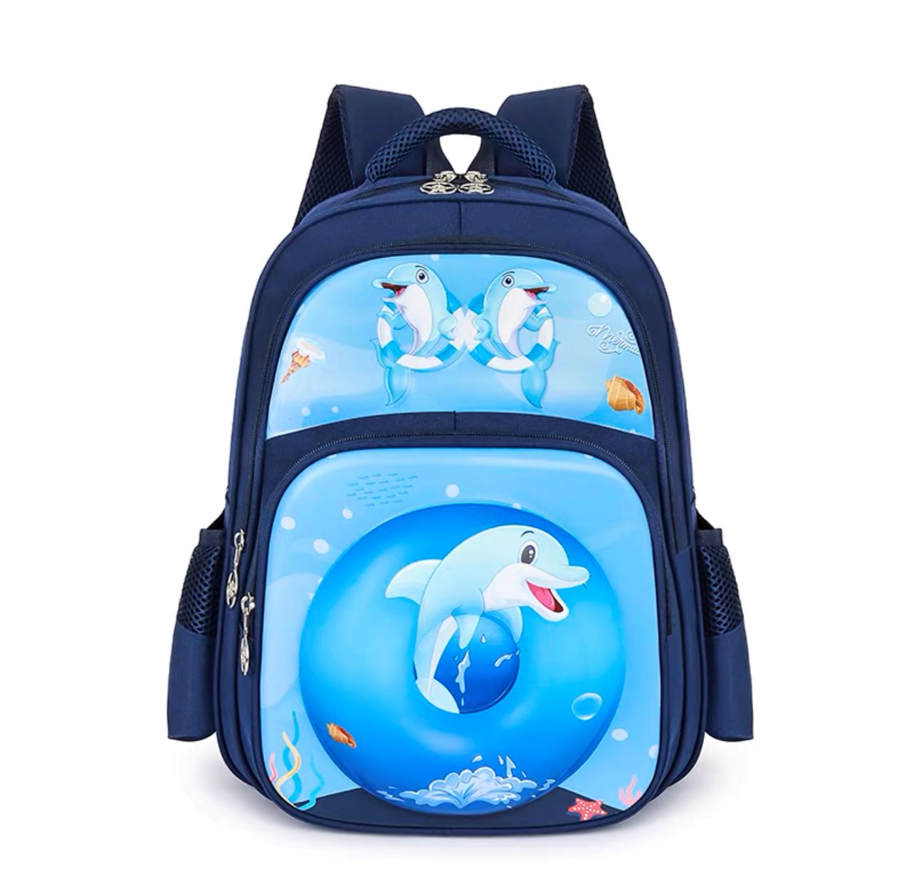 Дизайн: Рюкзак украшен изображениями дельфинов, рыбок и пузырей. Верхний карман имеет изображение двух дельфинов, выпрыгивающих из воды, а нижний карман - изображение одного дельфина в окружении пузырей, рыбок и водорослей.
