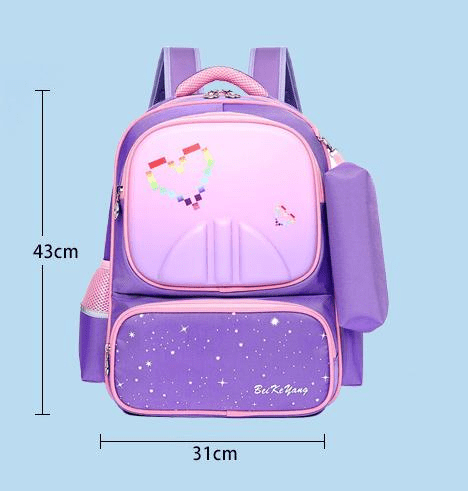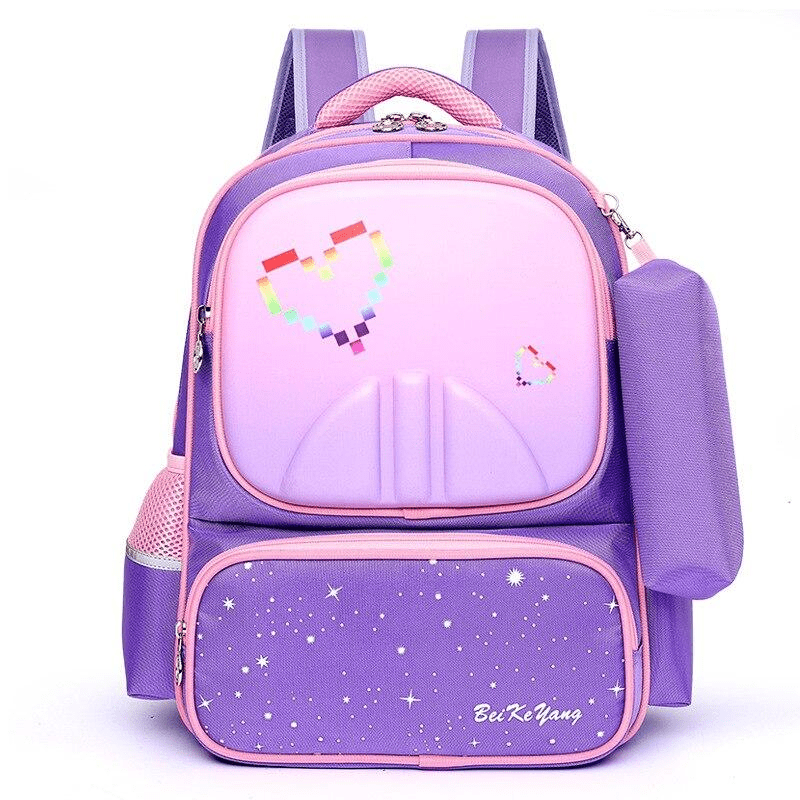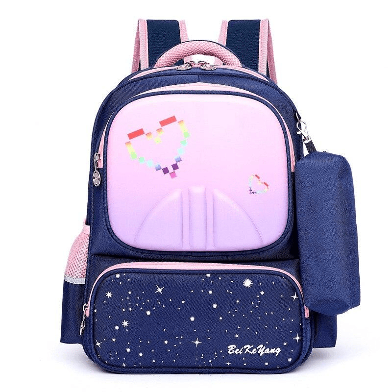 Дизайн: Рюкзак выполнен в темно-синем цвете с розовыми и фиолетовыми акцентами. На переднем кармане изображен звездный ночной дизайн с надписью "BeiKeYang". Основное отделение имеет светло-фиолетовый цвет с пиксельным сердцем, сделанным из маленьких разноцветных квадратов. Также имеется небольшой съемный чехол, прикрепленный к боковой стороне рюкзака.
