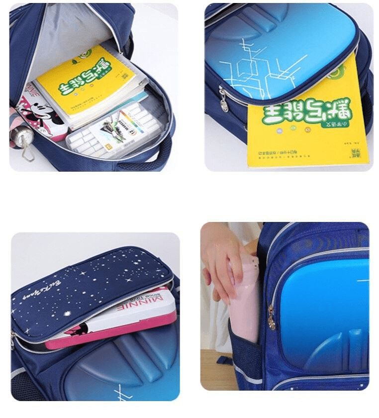 Отделения: Вместительное основное отделение для книг, игрушек и других необходимых вещей, а также дополнительные карманы для мелочей.
