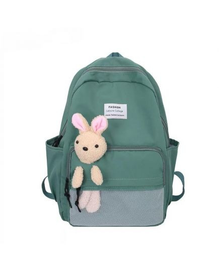 Эта сумка представляет собой рюкзак зеленого цвета с несколькими отделениями. На передней части рюкзака прикреплена мягкая игрушка в виде кролика с розовыми ушками. На верхнем кармане рюкзака находится нашивка с надписью "FASHION Leisure Color". Рюкзак имеет сетчатый карман на передней стороне и боковые карманы.