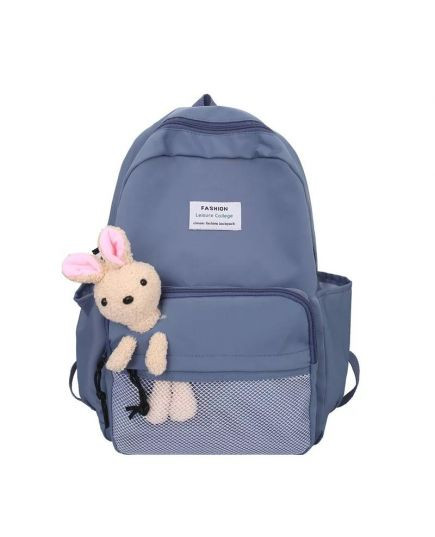 Эта сумка представляет собой рюкзак синего цвета с несколькими отделениями. На передней части рюкзака прикреплена мягкая игрушка в виде кролика с розовыми ушками. На верхнем кармане рюкзака находится нашивка с надписью "FASHION Leisure Color". Рюкзак имеет сетчатый карман на передней стороне и боковые карманы.