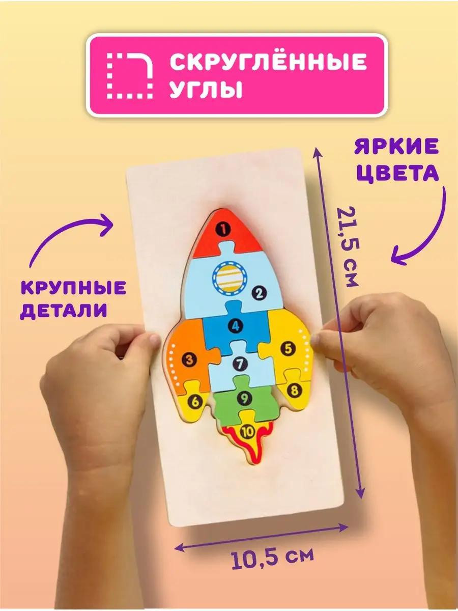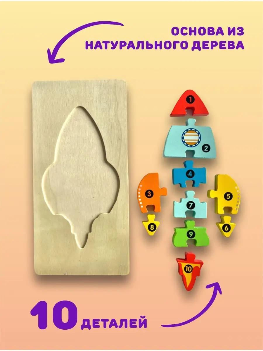Обучающий пазл-головоломка из дерева в форме ракеты. В комплекте 10 крупных деталей, каждая с цифрой от 1 до 10. Яркие цвета и безопасный дизайн способствуют раннему развитию, обучению счёту и координации движений.