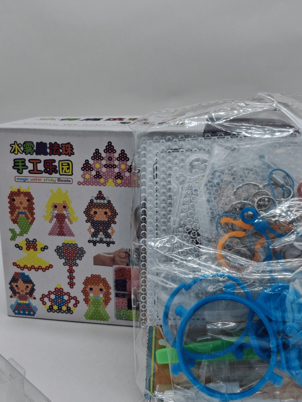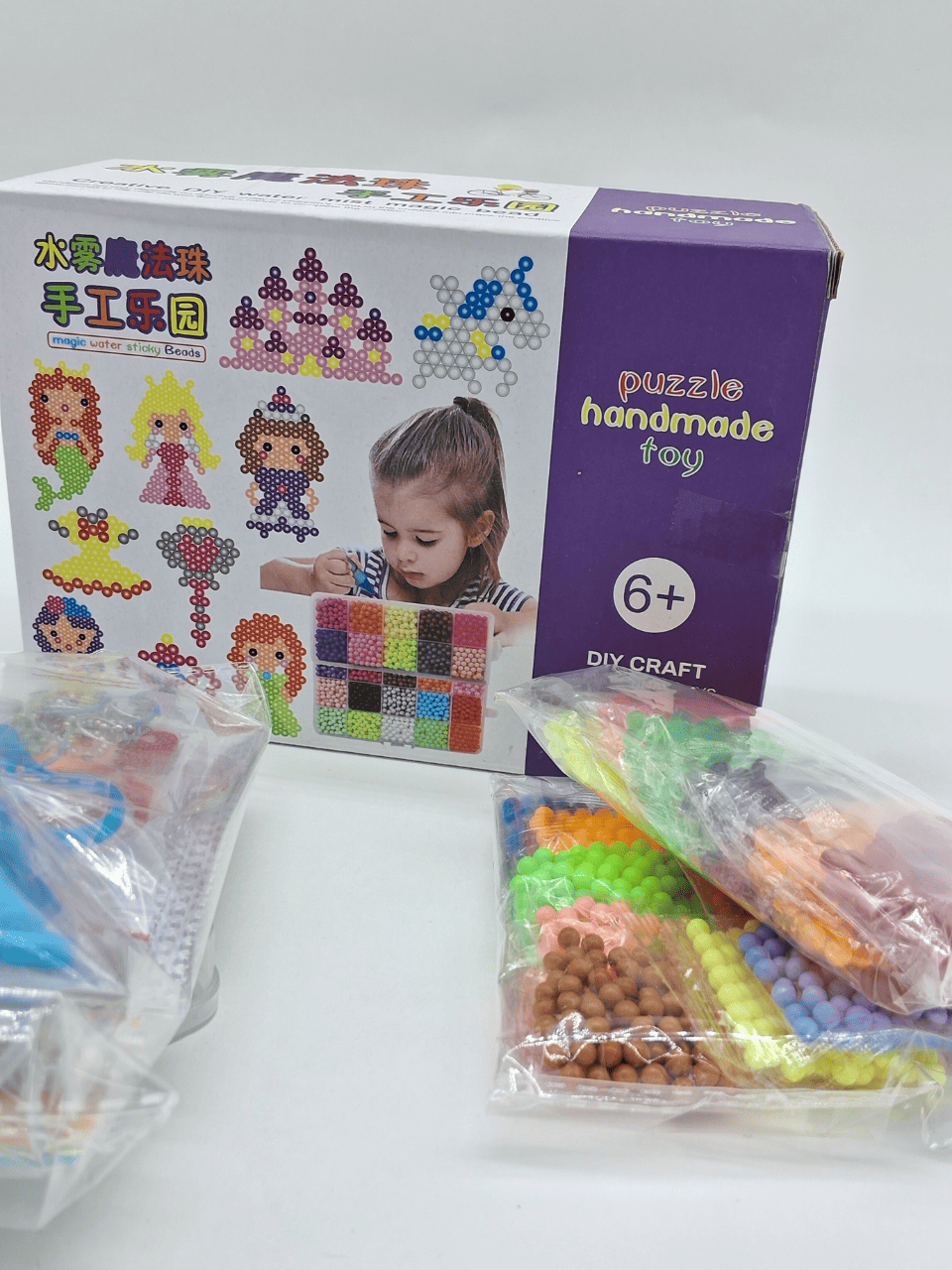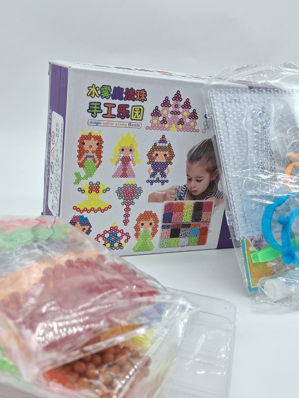 • Как собрать? Ребенок выкладывает бусины на специальной досточке с помощью руки или пинцета. Собранная картинка брызгается водой из бутылочки, которая входит в набор. Оставим заготовку на 60-120 минут для соединения элементов.