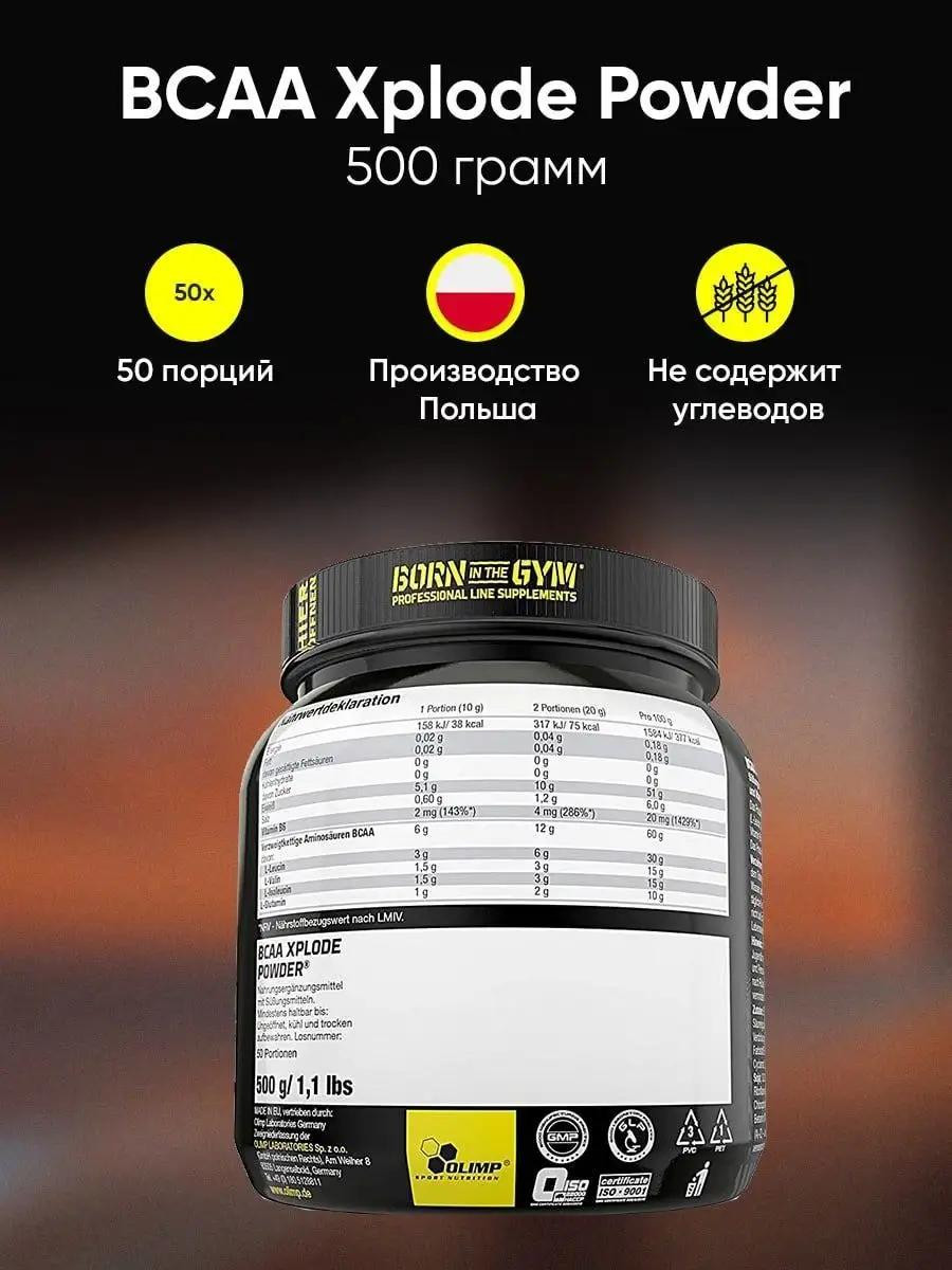 Olimp BCAA Xplode - это пищевая добавка спортивного питания, в состав которой входит комплекс аминокислот, витамин В6 и L-глютамин. Идеально подходят как для любительских, так и для профессиональных тренировок. Преимущества: дополняет рацион спортсмена аминокислотами; повышает выносливость мышц; снимает усталость во время тренировок; уменьшает крепатуру в мышцах после тренировки; помогает физическому восстановлению после тяжелых нагрузок; сжигает жировые отложения во время физических нагрузок; способствует росту мышц; нормализует энергообмен и разгоняет метаболизм; многообразие восхитительных вкусов. В состав одной порции входит 6 г BCAA и 1 г глютамина. Без углеводов. Аминокислоты Олимп отличаются превосходной растворимостью и высокой усвояемостью организмом. Практически мгновенно попадают в мышцы, что обеспечивает результативность тренировки. Аминокислотный комплекс можно применять до, во время или после тренировки.