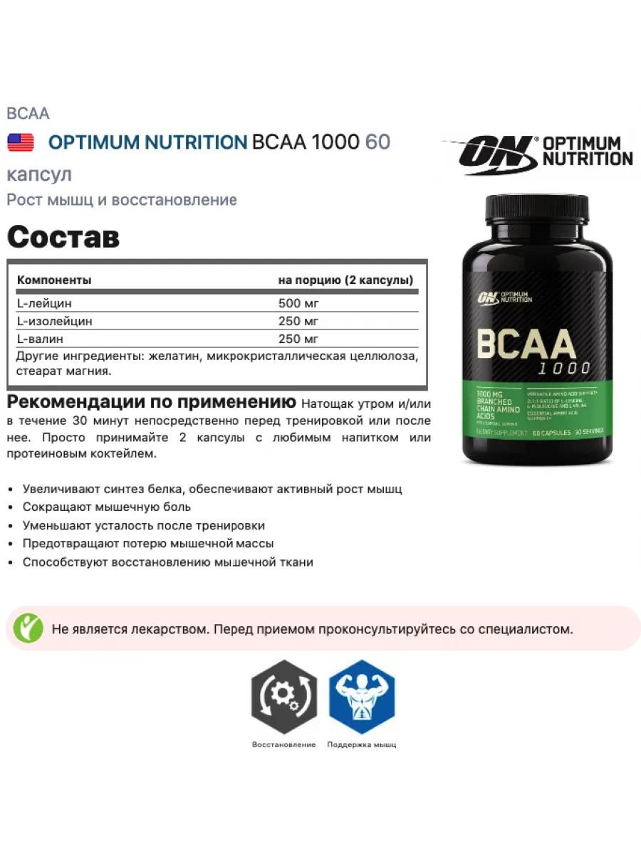 Аминокислотный комплекс OPTIMUM NUTRITION BCAA 1000 MG 2-1-1 - эта уникальная добавка разработана специально для спортсменов и людей, занимающихся интенсивными тренировками и стремящихся достичь максимальных результатов. Изолейцин, лейцин и валин, которые содержатся в BCAA, являются незаменимыми аминокислотами, которые играют важную роль в росте и восстановлении мышц после физических нагрузок. BCAA эффективно способствуют синтезу белка и ускоряют рост мышц. Прием аминокислот BCAA перед тренировкой повышает энергию и силу, что особенно важно для мужчин и женщин, занимающихся спортом. Он также увеличивает выносливость во время интенсивных тренировок и способствует более быстрому восстановлению после физической нагрузки. Необходимо отметить, что БЦА является спортивным питанием и рекомендуется применять для достижения оптимальных результатов. Это особенно важно для профессиональных спортсменов и людей, которые стремятся увеличить мышечную массу и повысить физическую форму. БЦАА помогает предотвратить разрушение мышц, улучшает восстановление организма после активных тренировок и способствует набору мышечной массы. Кроме того, этот продукт может быть полезен при похудении, так как BCAA ускоряет обмен веществ и сжигание жира, сохраняя при этом мышечную массу. Благодаря этому, вы сможете достичь желаемого результата в кратчайшие сроки. Как принимать? Рекомендуется принимать BCAA 1000 натощак утром и/или в течение 30 минут непосредственно перед тренировкой или после нее. Просто принимайте 2 капсулы с любимым напитком или протеиновым коктейлем.