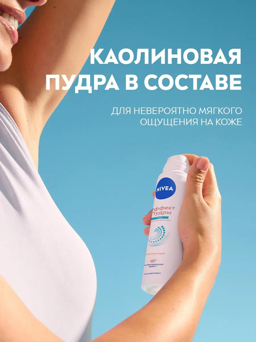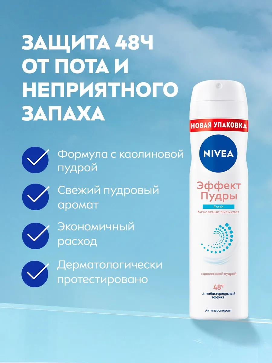 Дезодорант-антиперспирант спрей «ЭФФЕКТ ПУДРЫ FRESH»* от NIVEA с антибактериальным комплексом** сочетает в себе свойства классического «Эффекта пудры» и приятный освежающий пудровый аромат. В основе формулы – по-прежнему природная каолиновая пудра, благодаря которой дезодорант мгновенно высыхает, не оставляет ощущения липкости и делает кожу мягкой и бархатистой. Нежная формула с частицами пудры, легким ароматом FRESH* и антибактериальным комплексом дарит коже заботу и свежесть. Дезодорант-антиперспирант «Эффект пудры Fresh» защищает от пота и запаха в течение 48 часов*** и создает невероятно мягкое ощущение на коже, делает ее бархатистой. Кожа невероятно нежная и матовая, как после пудры. Каолиновая пудра позволяет дезодоранту высыхать мгновенно, не оставляя чувства липкости. Дерматологически протестировано. Применение: хорошо встряхнуть перед использованием. Распылять в области подмышек на чистую и сухую кожу с расстояния 15 см. Дать полностью высохнуть во избежание образования пятен на одежде. Не наносить на поврежденную или раздраженную кожу.