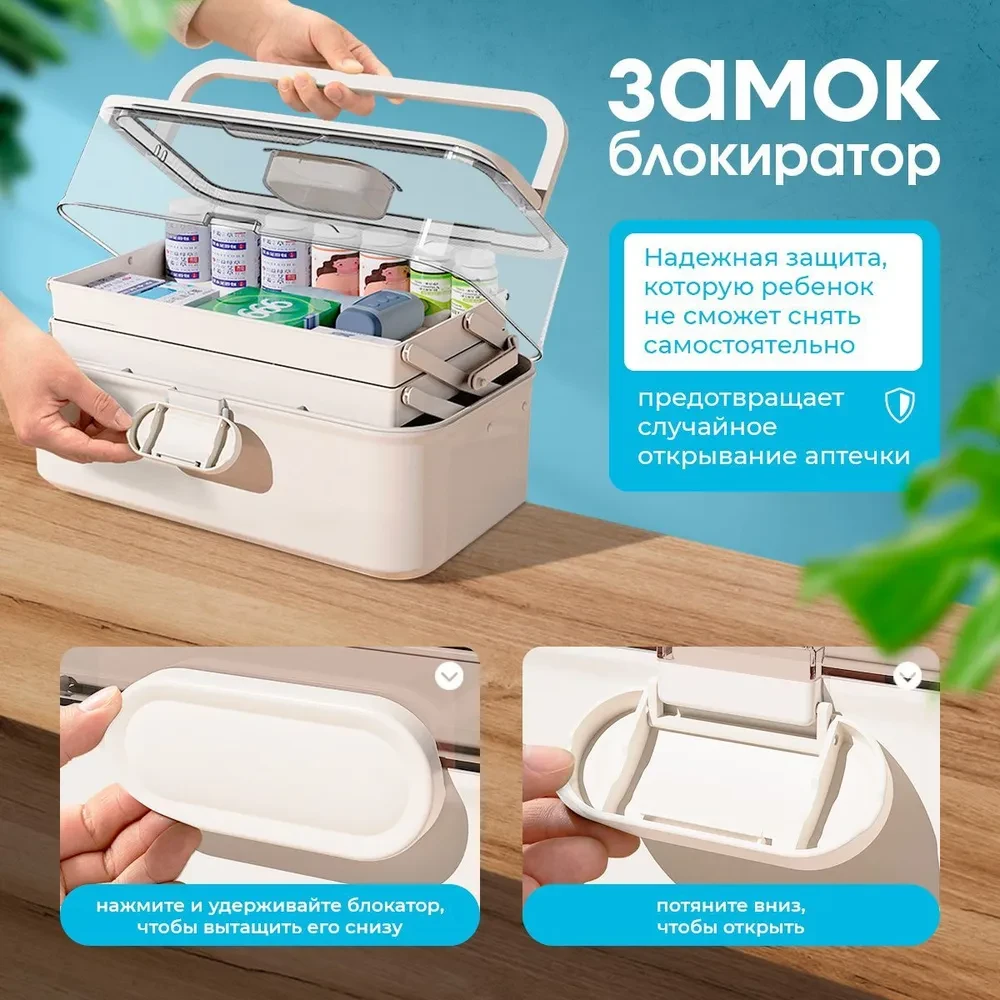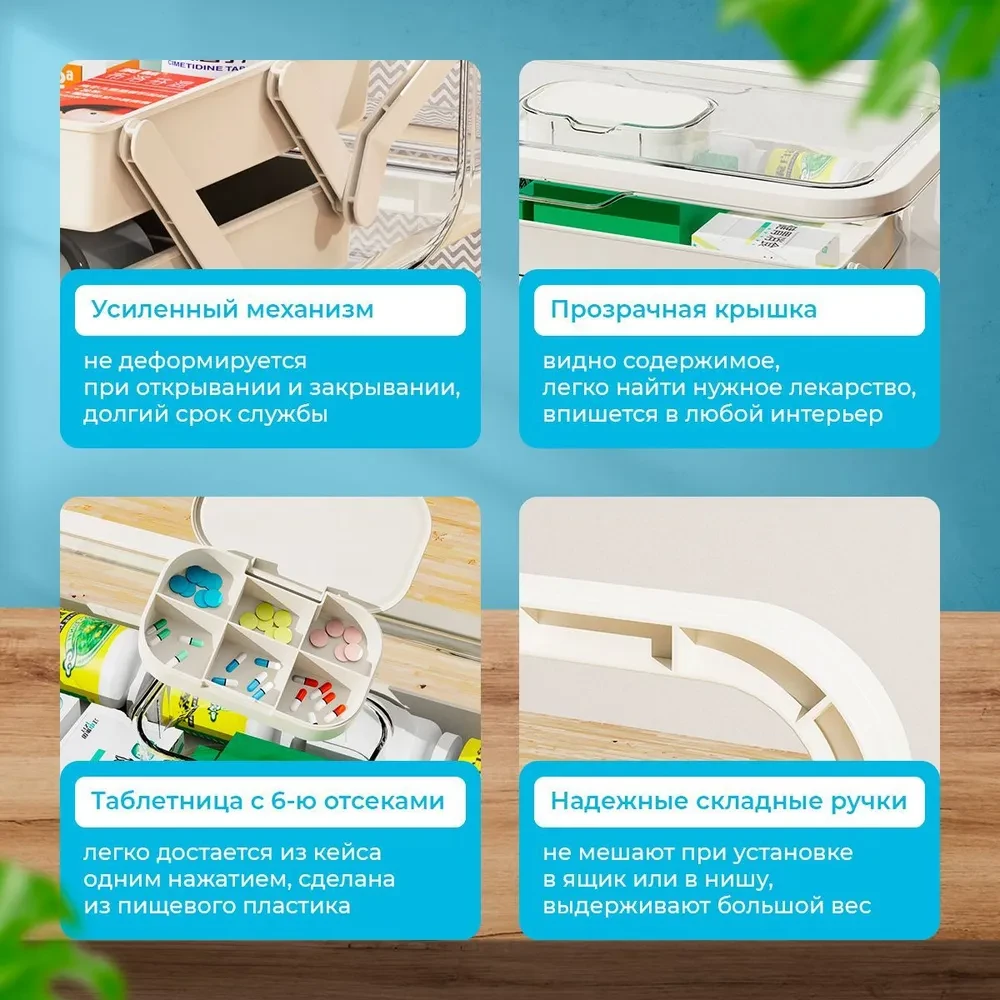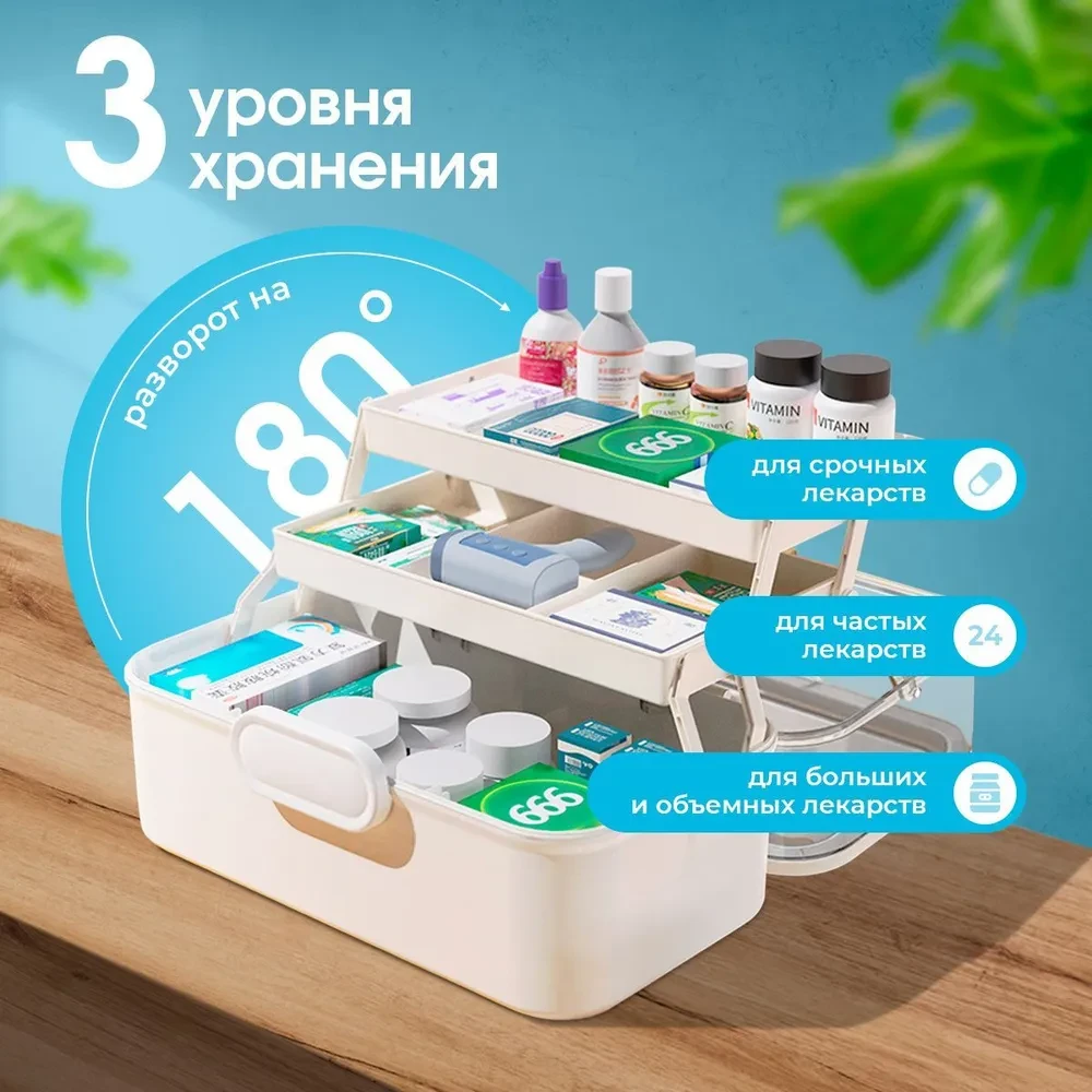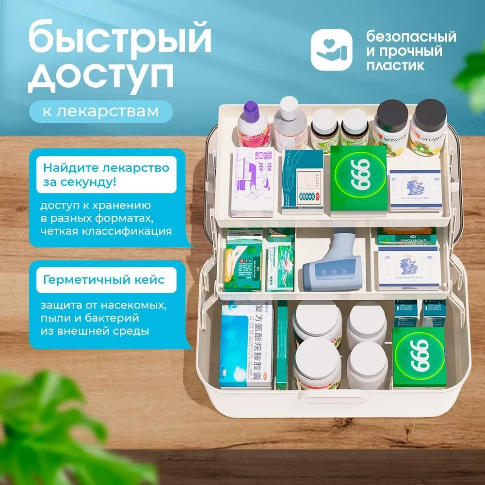 Домашняя аптечка с контейнером и таблетницей — это идеальный органайзер для хранения лекарств и медикаментов в вашем доме. Этот большой пластиковый аксессуар с крышкой обеспечит надежное и удобное укрытие для всех ваших препаратов, позволяя сохранить порядок и доступность в экстренной ситуации.Она компактная, но в то же время вместительная. Контейнер изготовлен из прочного и легкого материала, что делает его идеальным выбором для повседневного использования.