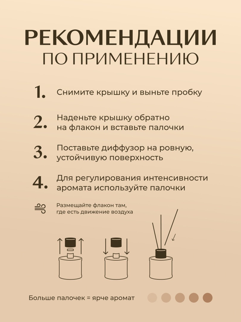 Воспользуйтесь рекомендациями по применению ароматизатора для дома с палочками, чтобы получить только наслаждение от использования нашего товара. Снимите крышку, вставьте нужное количество фибровых палочек (чем больше, тем интенсивнее парфюмированный стойкий аромат), наденьте крышку обратно. Переворачивайте палочки арома диффузора каждые 3-4 дня для равномерного распределения аромата.