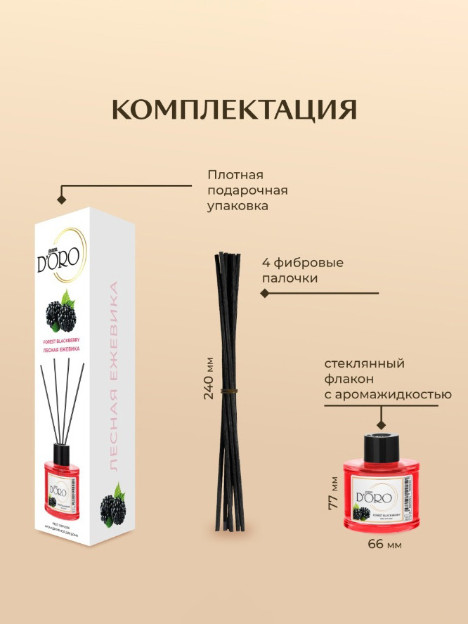 Создайте загадочную и многогранную атмосферу с помощью аромадиффузора с палочками "Лесная ежевика" от GAMMA D'ORO. Наш парфюм для дома имеет свежий, немного сладковатый и терпкий аромат лесной ежевики, такой же загадочный и многогранный, как и вкус самой ягоды. Этот аромат для дома позволит каждому найти что-то своё, создавая уютную и комфортную обстановку.