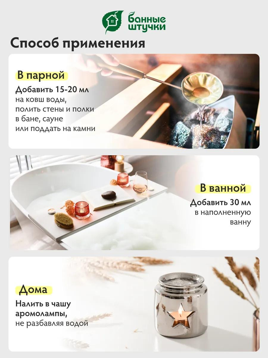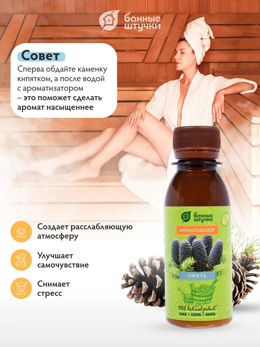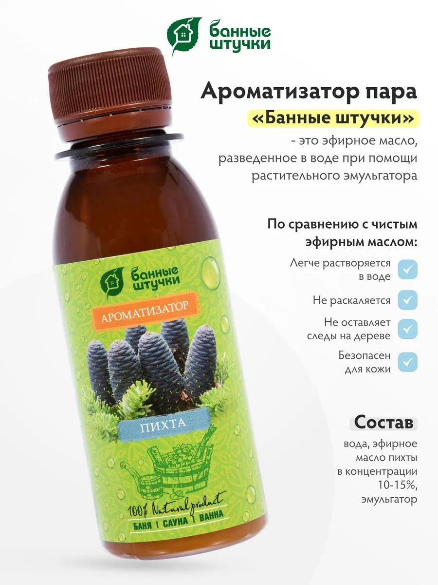 Ароматизаторы для бани на основе натуральных эфирных масел обладают множеством полезных свойств: они помогают расслабиться, улучшить дыхание, стимулируют кровообращение и поддерживают иммунитет. Эфирные масла, такие как пихта обладают антисептическими и противомикробными свойствами, что способствует очищению воздуха и созданию приятной атмосферы в бане. Также их использование улучшает состояние кожи и оказывает положительное воздействие на эмоциональное состояние, превращая поход в парную в полноценную ароматерапию. Рекомендации по применению: взболтать, добавить 15- 20 мл на ковш воды, полить стены и полки в бане, сауне или поддать на камни, также можно добавить 30 мл в наполненную ванну. Для улучшения эффекта каменку в первый раз желательно облить простой водой, а затем с добавление аромо масла. Так аромат будет ярким и стойким. Вкусный пар "Банные штучки" изготавливает более 10 лет, мы являемся экспертами в традиционной бане и сауне.