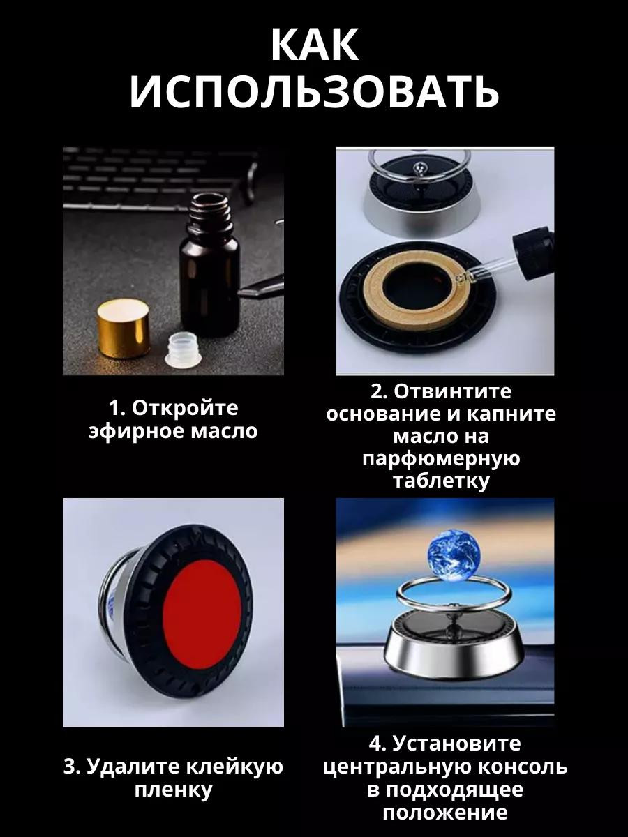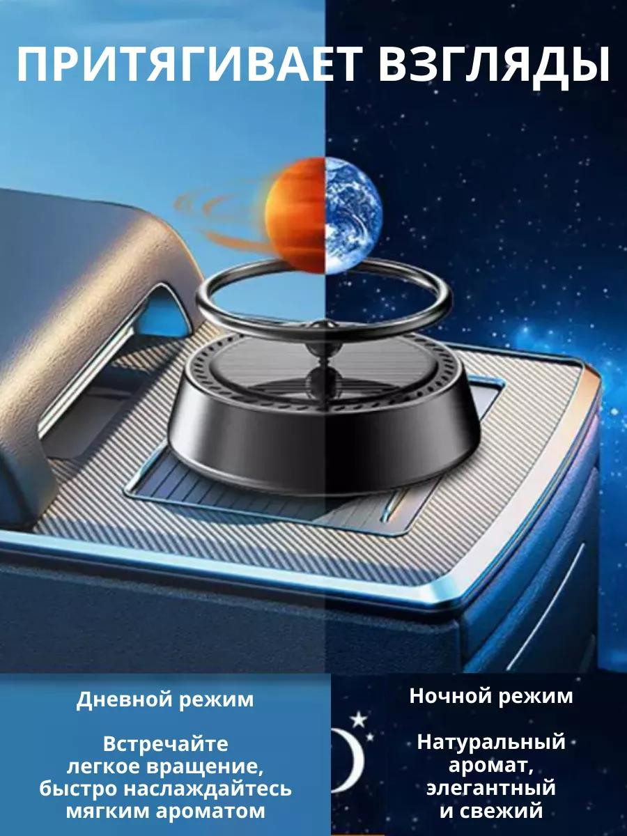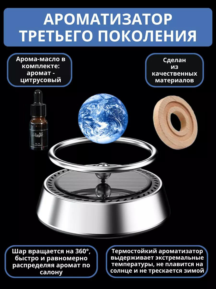 Ароматизатор в машине в виде вращающейся на 360 градусов планеты Земля-это не просто приятный автоосвежитель,но и стильное дополнение к интерьеру. Наши освежители изготовлены из авиационного сплава,устойчивого к высоким и низким температурам, что гарантирует их долговечность и стойкость аромата. Работая от солнечной энергии, естественно и эффективно очищает воздух от дыма, равномерно распределяет арома-масло. Для тех,кто ценит удобство,мы предлагаем автопарфюм, который легко устанавливается на панель или иную поверхность столешницы благодаря клеевой основе. Наши автоаксессуары представлены в различных дизайнах ,поэтому вы сможете подобрать идеальный вариант для себя. Забудьте о неприятных запахах–наш парфюм решит эту проблему, создавая уникальную обстановку, которая поможет вам расслабиться и насладиться каждым мгновением. Многоразовая пахучка–это не только удобно,но и экономично. Вам не придется постоянно покупать новую, а достаточно просто заменить сменный блок. Аромамасло станет отличным выбором для тех, кто хочет создать уютную атмосферу или сделать прекрасный необычный подарок для дорогого человека-любимого, мужа, брата, дедушки, папы, коллеги. Не упустите возможность приобрести креативный аксессуар в салон с длинным сроком эксплуатации по выгодной цене.