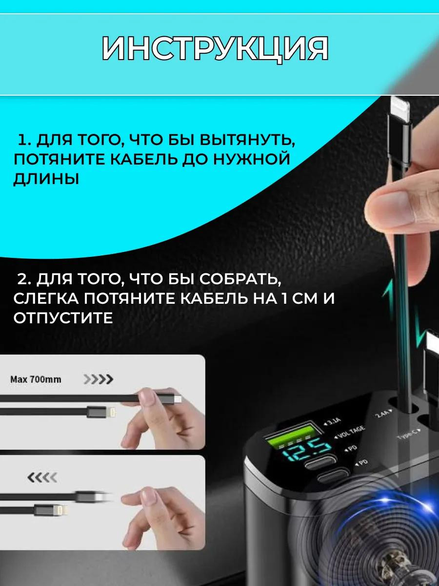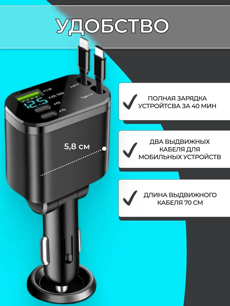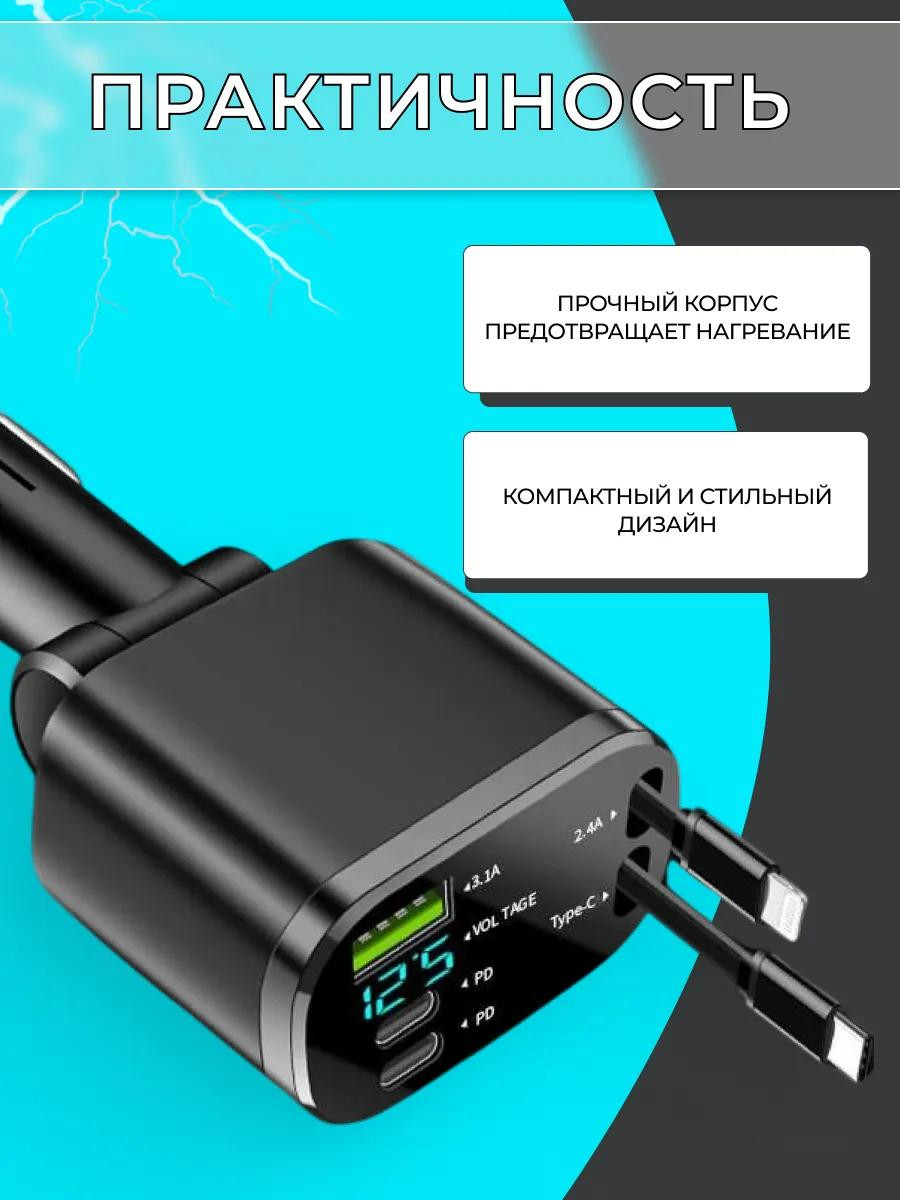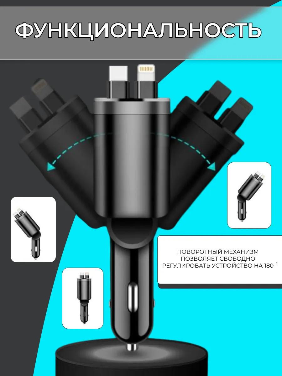 Многофункциональное зарядное устройство для автомобиля подходит для одновременной зарядки до 5 устройств. Оснащено двумя выдвижными кабелями (Type-C и Lightning), встроенным вольтметром и поворотным механизмом для удобной настройки угла использования. Идеальное решение для водителей, которым важно быстро и безопасно заряжать гаджеты в пути.