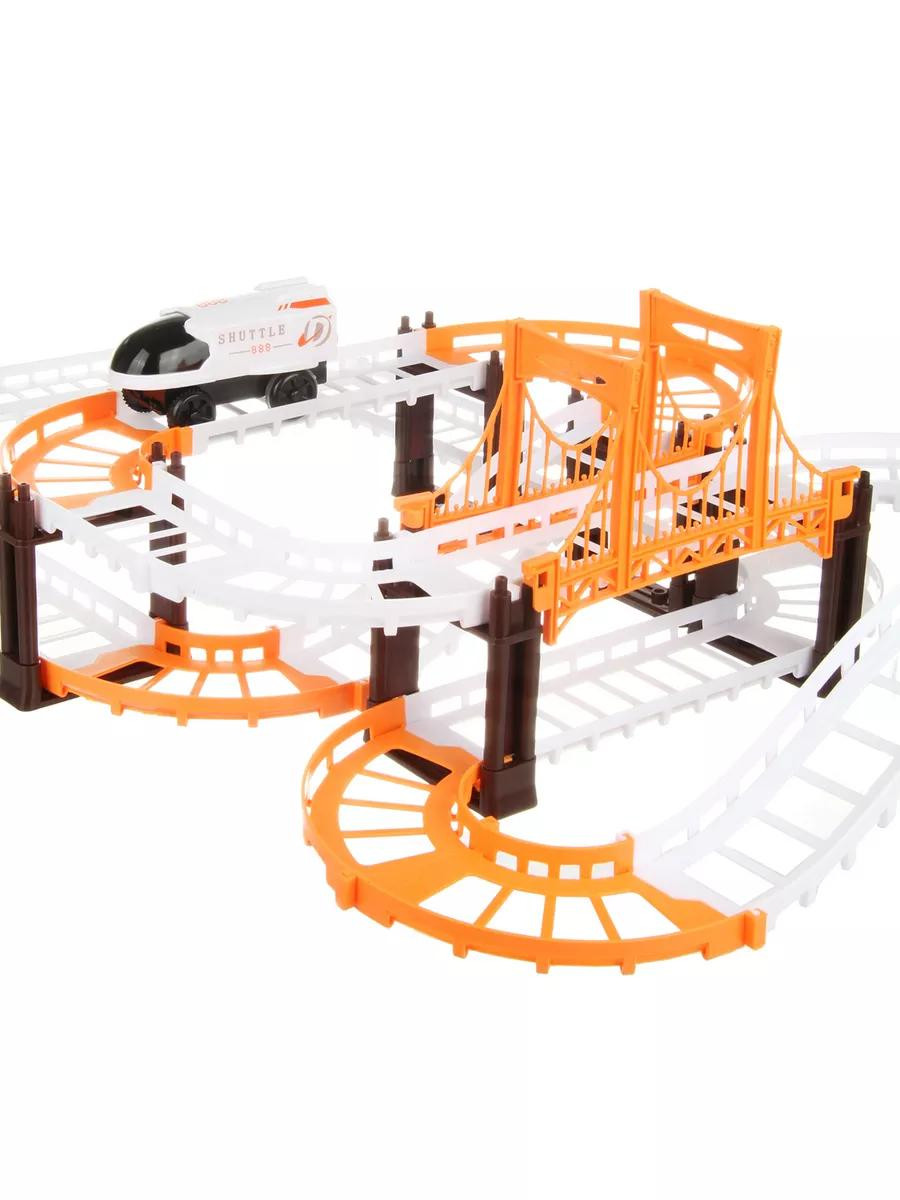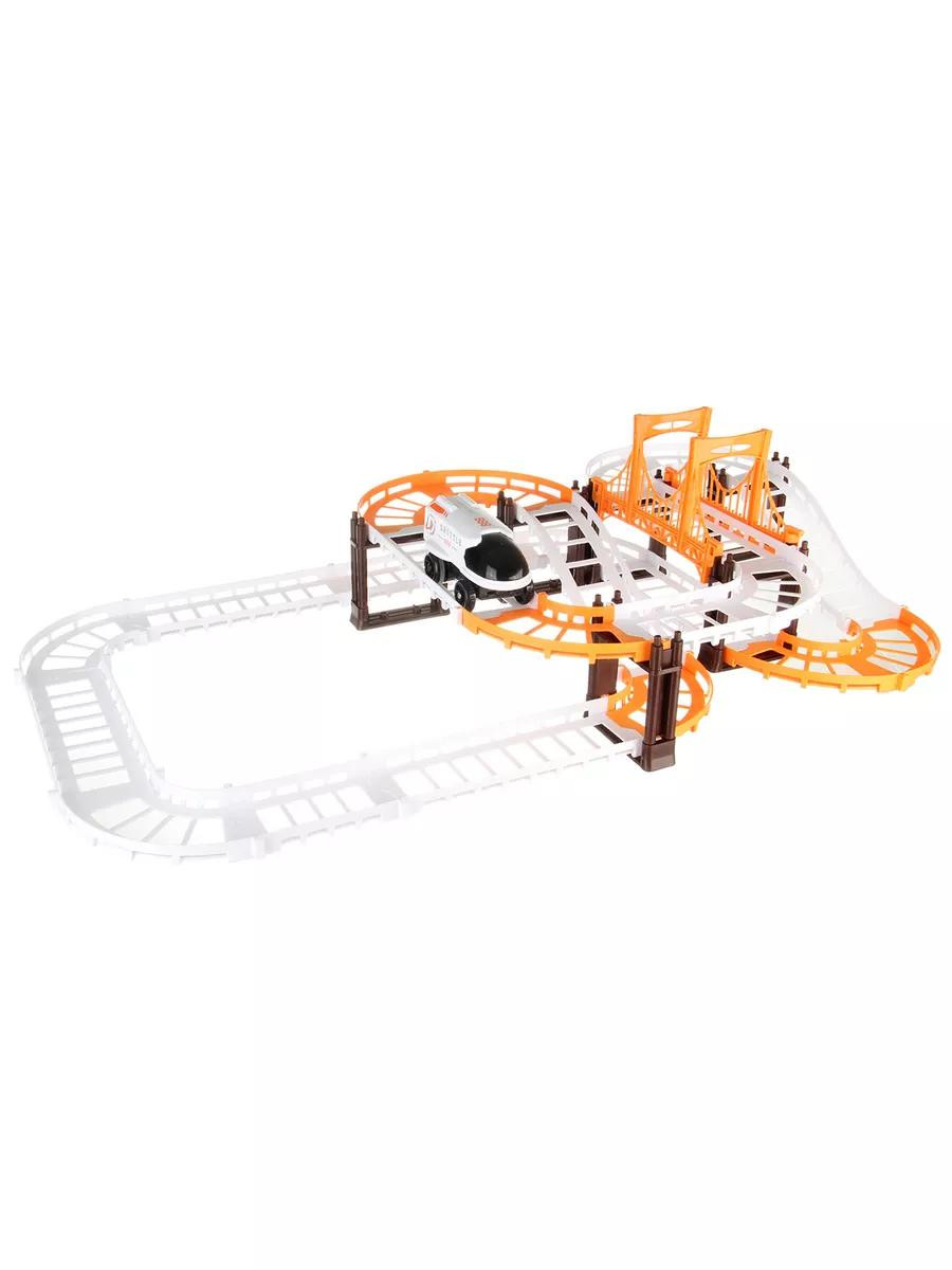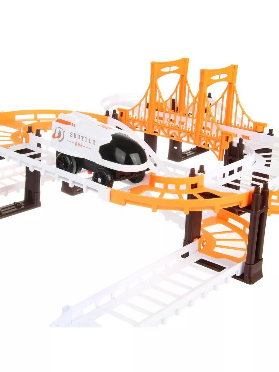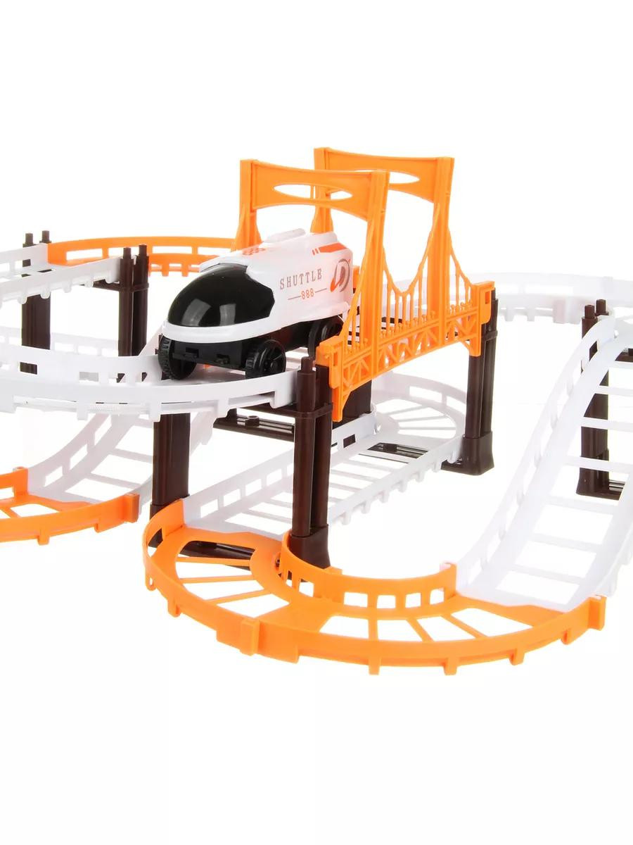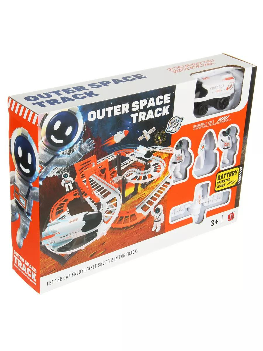 Игрушечный трек, выполненный в космической тематике, с фигурками космонавтов, компактной машинкой и ракетой. Два яруса, машинка катается с одного яруса на другой. Игрушка конструктор легко собирается, в разобранном виде удобно хранить в коробке. Трек изготовлен из прочных и долговечных материалов, станет замечательным подарком для мальчика и девочки на Новый год и День рождения. Комплектация. Детали для сборки трека, 2 космонавта, ракета, сегмент МКС, машинка. Машинка едет вперед по треку, заднеприводная. 44 детали. 39 элементов трека. Машинка работает от 1 батарейки АА, не входит в комплект. Полимер. Размеры трека 57х32х14 см. Ширина элемента трека 5 см. Размеры машинки 9х4х5 см. Размеры космонавта 4х2х6 см. Размеры сегмента МКС 11х2х6 см. Размеры ракеты 4х6 см. Размеры коробки 35х7х25 см.