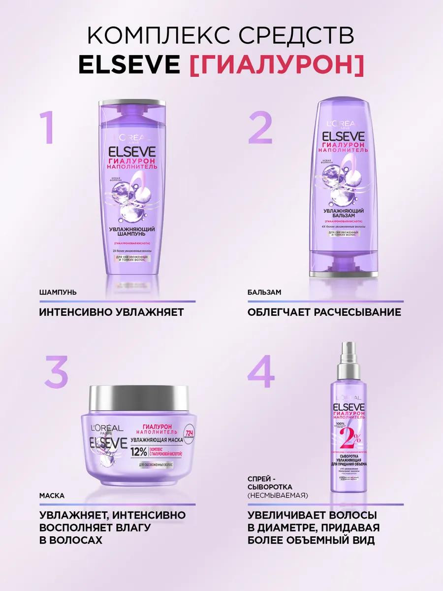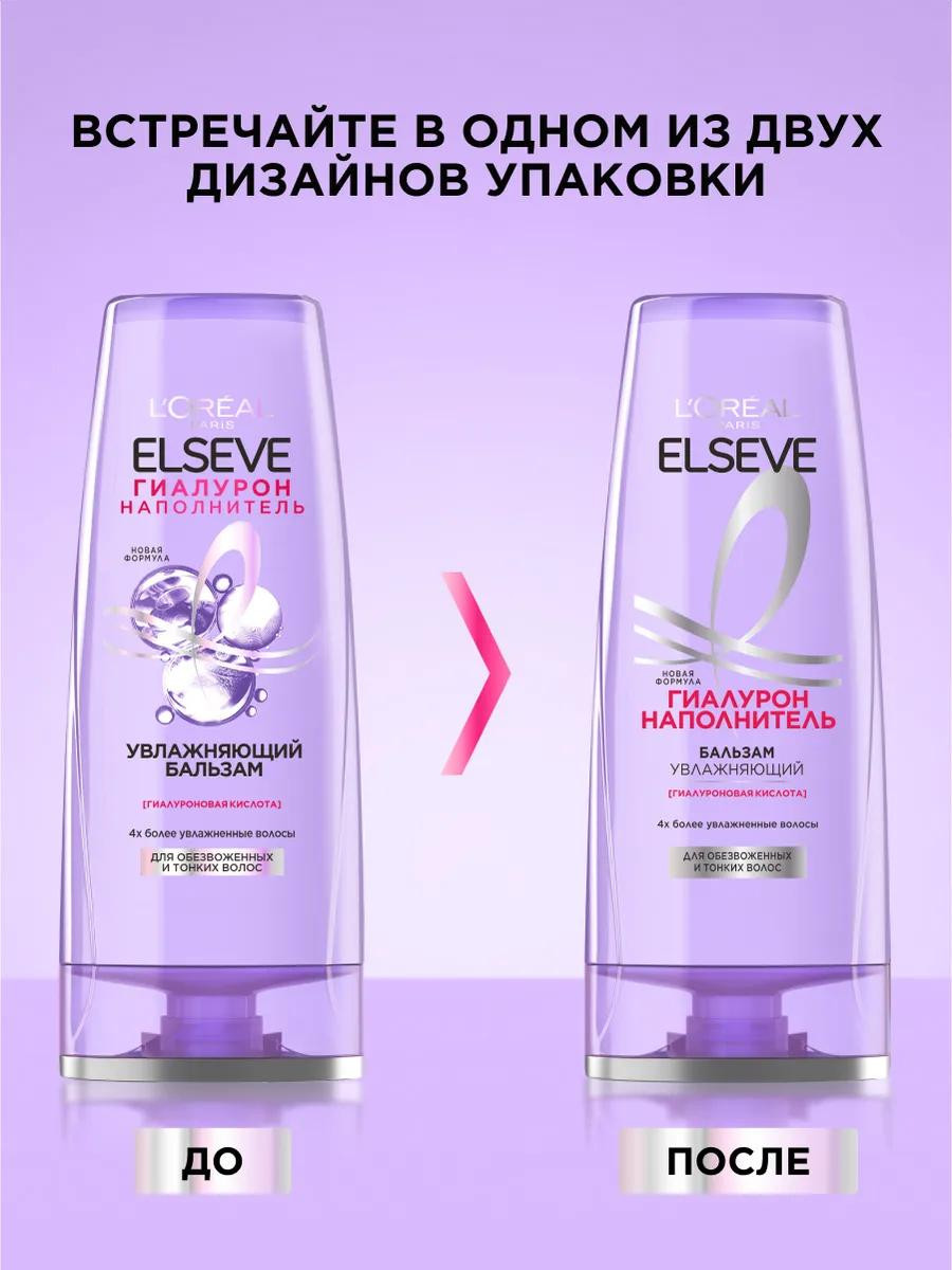 У Вас обезвоженные и тонкие волосы? Подарите своим волосам интенсивное увлажнение и легкое расчесывание! ELSEVE [Гиалурон] Наполнитель от L'Oreal Paris мгновенно преображает обезвоженные волосы, наполняя влагой, делает их блестящими, объемными и упругими без утяжеления. Увлажняющий бальзам Эльсев заметно облегчает расчесывание, интенсивно увлажняет на 72 часа, при совместном применении с шампунем придает объем. Волосы в 10 раз более увлажненные. 24 часа упругости. Волосы выглядят более объемными после совместного применения шампуня и бальзама. действие гиалуроновой кислоты - Молекула гиалуроновой кислоты способна удержать воды в 1000 раз больше собственного веса. Как своеобразный водный резервуар, она наполняет волосы влагой, делая их плотными и упругими. Способ применения: После применения шампуня нанесите на влажные волосы, распределяя по всей длине до кончиков. Оставьте на 1 минуту, смойте. При попадании в глаза немедленно и тщательно промойте водой. Пожалуйста, выключайте воду в душе.