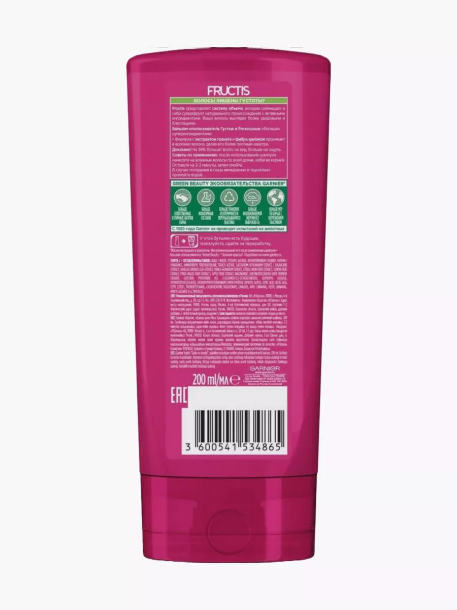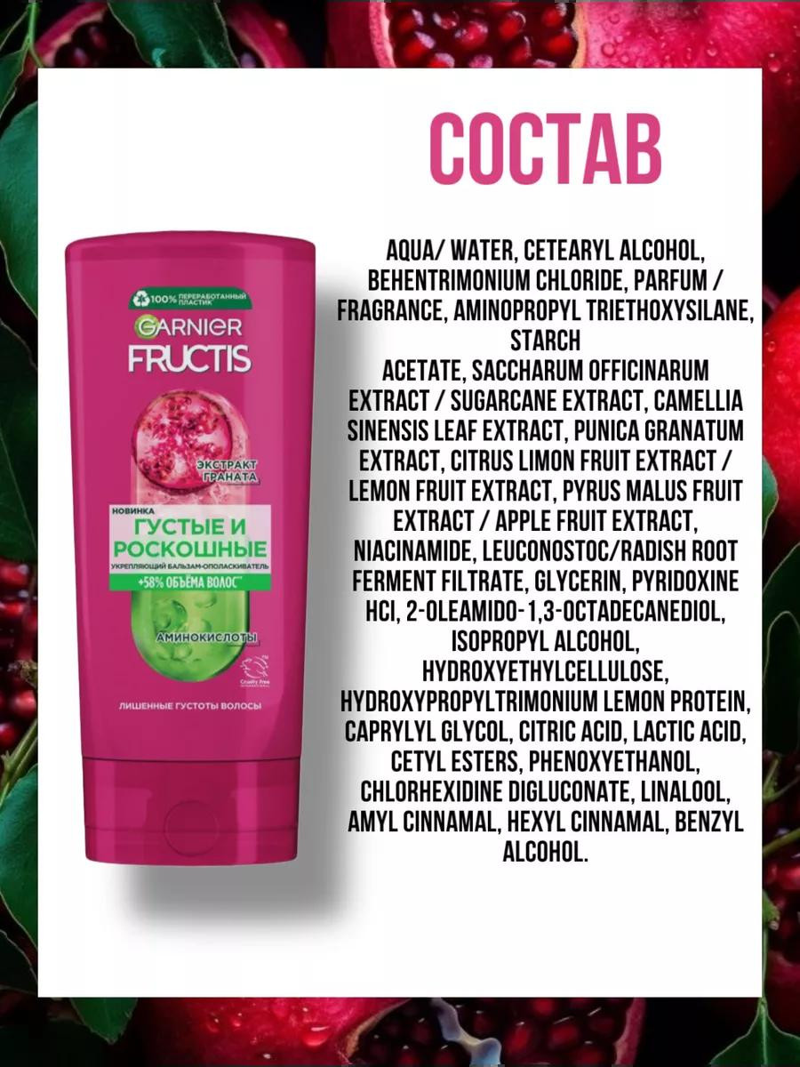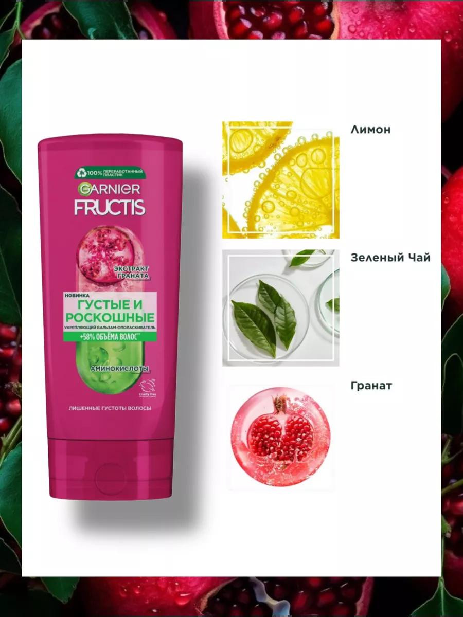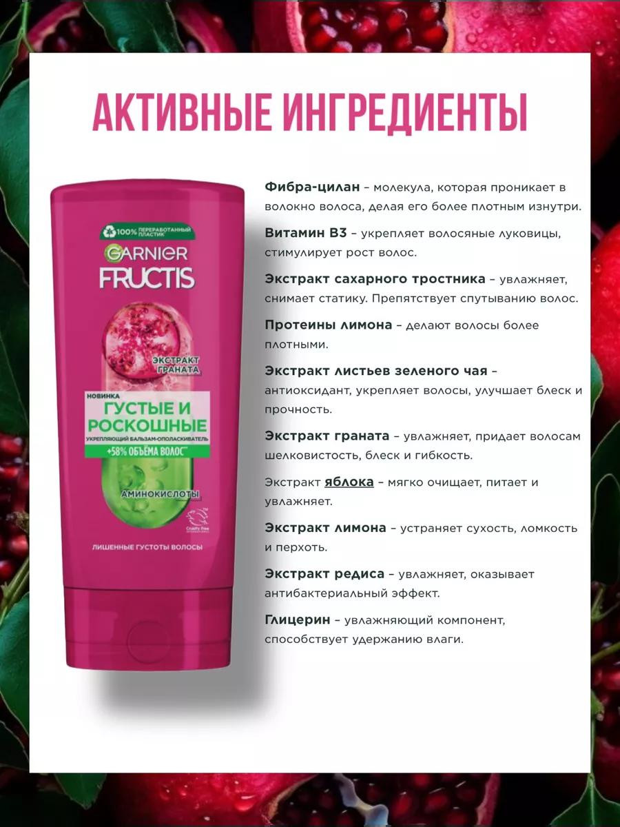 Бальзам-ополаскиватель с уникальной молекулой Фибра-цилан увеличивает объем и густоту волос. За счет уплотнения волокон изнутри волосы становятся более крепкими и выглядят гуще. Экстракт граната увлажняет, смягчает волосы, придавая им гибкость и шелковистость. С первого применения волосы более густые, струящиеся, легко расчесываются. День за днем масса волос увеличивается - это заметно на вид и на ощупь. Результат: мгновенно волосы более густые на вид, плотные на ощупь и крепкие, через 2 недели применения масса волос увеличена до 38%.