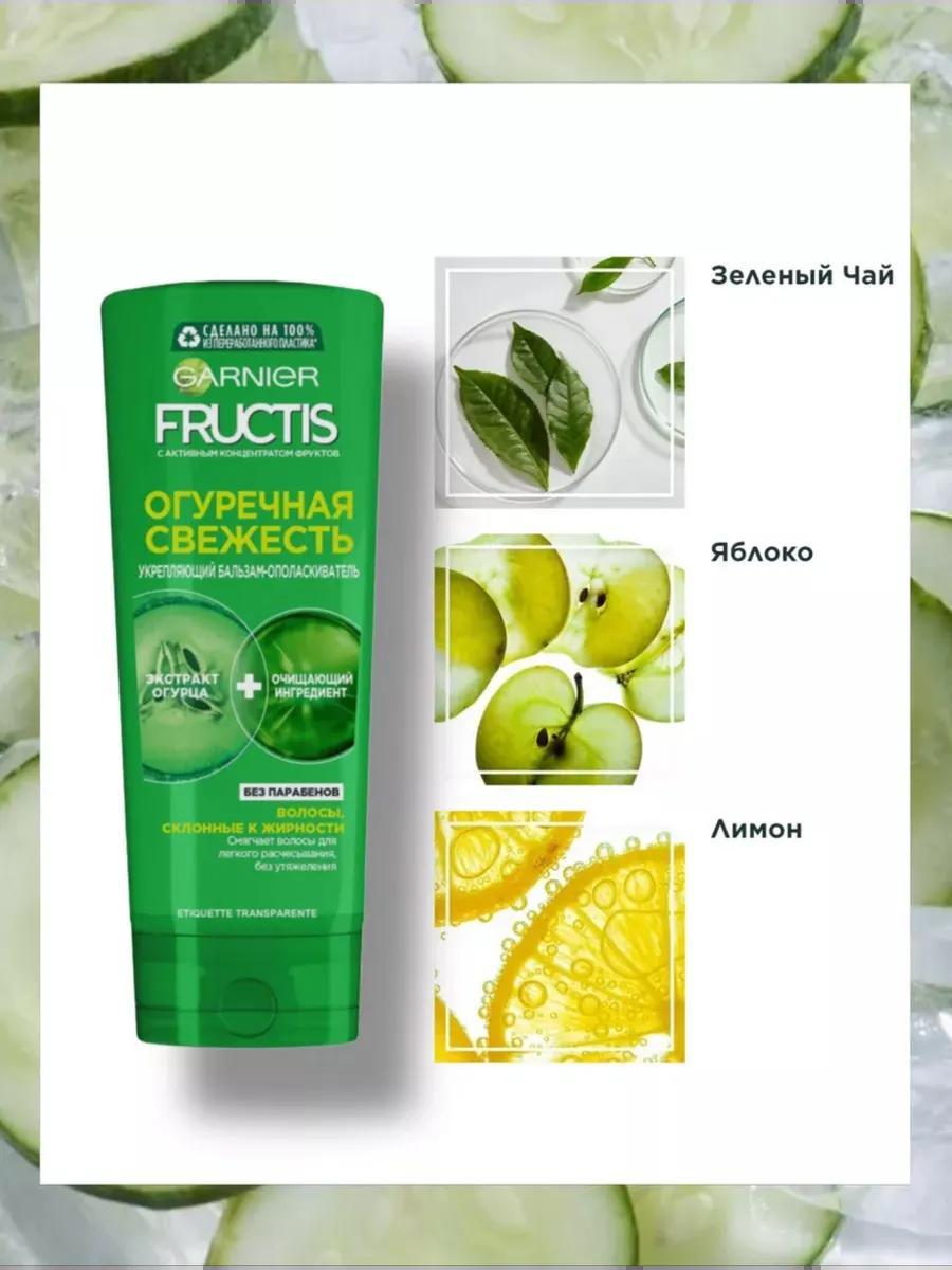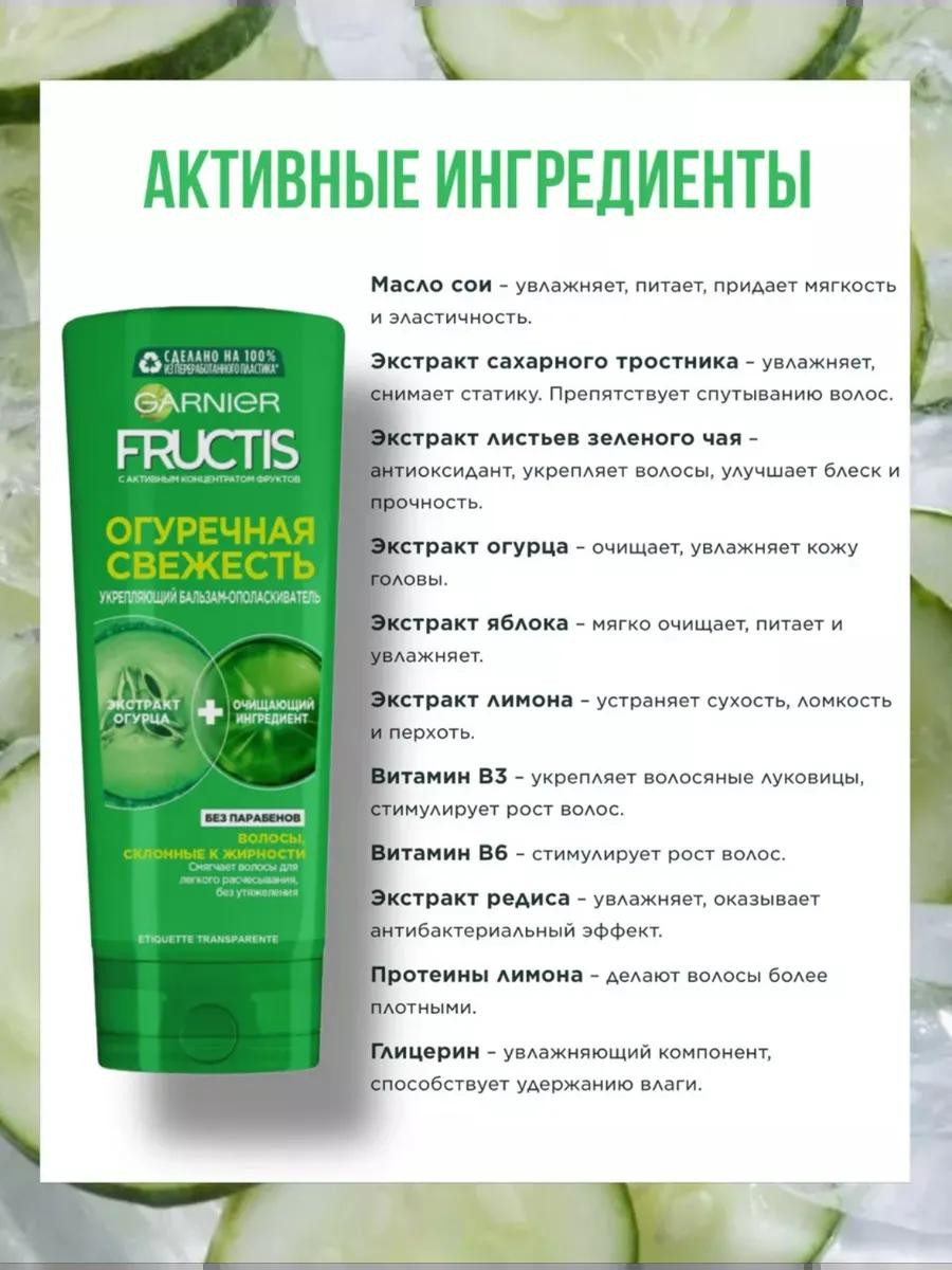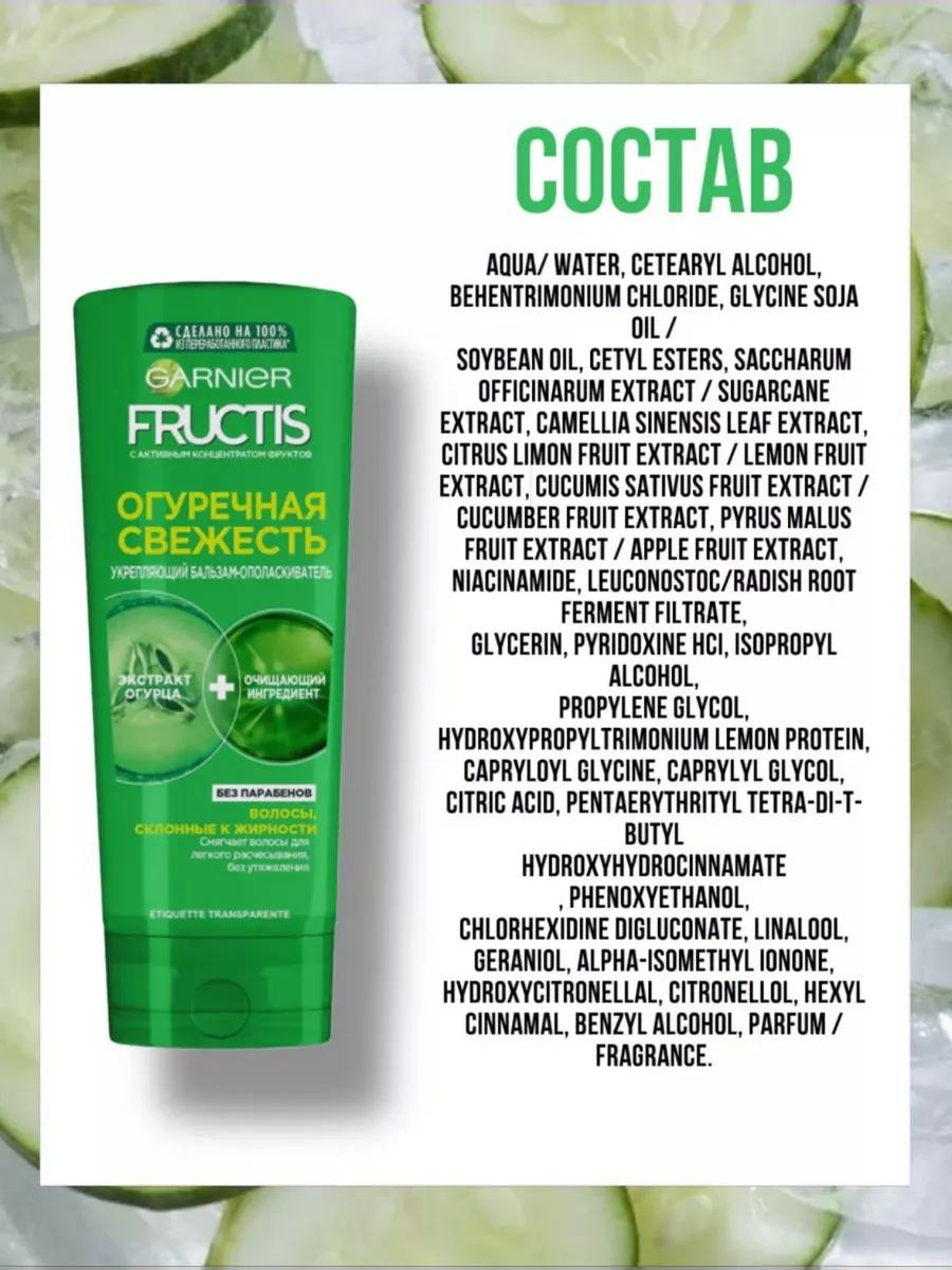 ВОЛОСЫ, СКЛОННЫЕ К ЖИРНОСТИ? Fructis (Фруктис) от Garnier (Гарньер) представляет систему увлажнения волос, которая совмещает в себе суперфрукт с активными ингредиентами. Ваши волосы выглядят здоровыми и сильными. Бальзам-Ополаскиватель Огуречная Свежесть обогащен суперингредиентами: Формула с экстрактом огурца и очищающим компонентом укрепляет и делает волосы более мягкими. Доказано! Волосы мягкие и послушные, без утяжеления. СПОСОБ ПРИМЕНЕНИЯ: После использования шампуня нанесите на влажные волосы по всей длине, избегая корней. Оставьте на 2-3 минуты, затем смойте. В случае попадания в глаза немедленно и тщательно промойте водой. 1. Cмягчает волосы. 2. Облегчает расчесывание. 3. Не утяжеляет. 4. Волосы выглядят здоровыми и сильными. 5. Укрепляет и делает волосы более мягкими. 6. Волосы более послушные. 7. Без парабенов.
