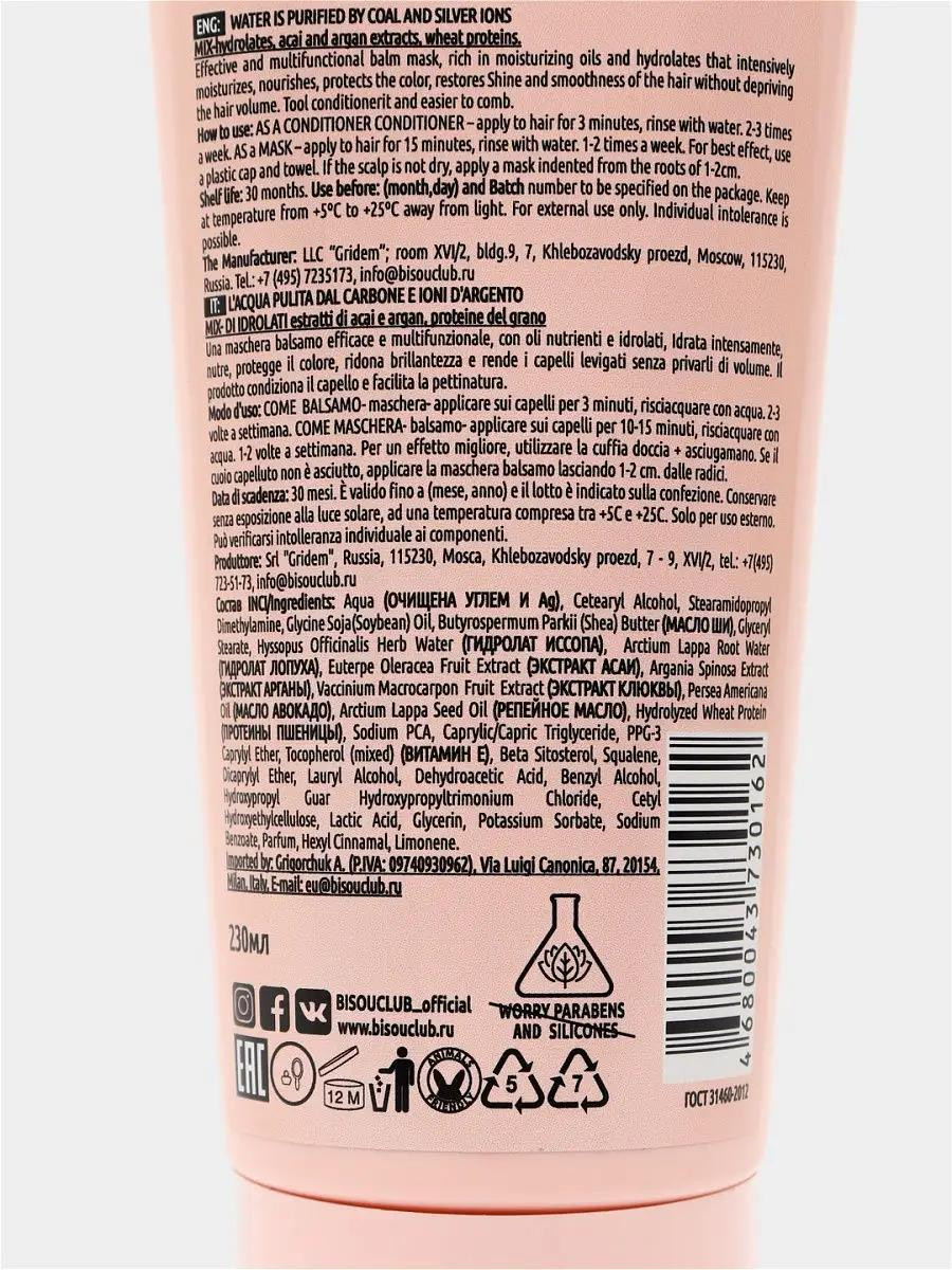Бальзам, маска для волос Защита цвета и увлажнение для окрашенных и тусклых волос, 230 мл. Гидролат иссопа, экстракты асаи, арганы и клюквы. 98% натуральных ингредиентов. Эффективная и мультифункциональная натуральная бальзам-маска для волос насыщена увлажняющими маслами и гидролатами, подходит для окрашенных, поврежденных и тусклых волос. Интенсивно увлажняет, питает, защищает цвет, восстанавливает блеск и гладкость волос, не лишая их объема. Эффективно кондиционирует и облегчает расчесывание. Способ применения: 1. как бальзам: нанесите на волосы на 3 минуты; смойте водой. Рекомендуем использовать 2 - 3 раза в неделю. 2. Как маска: нанесите на волосы на 10 - 15 минут; смойте водой. Рекомендуем использовать 1 - 2 раза в неделю. Для лучшего эффекта используйте полиэтиленовую шапочку и полотенце. Наносите бальзам маску с отступом от корней 1 - 2 см.