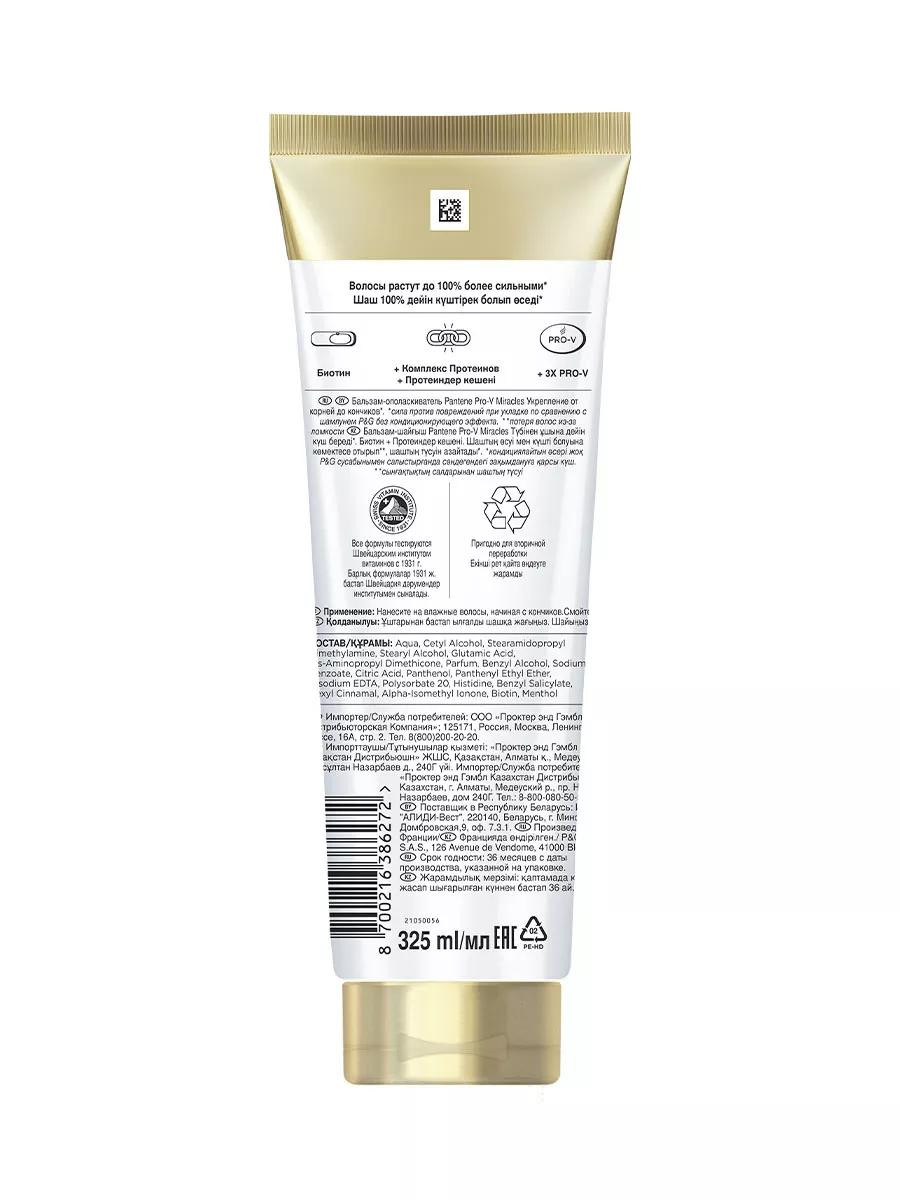 Бальзам - ополаскиватель Pantene Miracles, Укрепление от корней до кончиков, 160 мл. Бальзам - ополаскиватель Pantene Pro - V Miracles Укрепление от корней до кончиков помогает уменьшить выпадение волос, вызванное ломкостью, чтобы волосы росли сильными (устойчивость к повреждениям при укладке) от корней до кончиков. В основе формулы лежат специально отобранные питательные вещества, включая биотин, укрепляющий комплекс и высокопитательную смесь Pro - V. Для сухих волос, склонных к ломкости. Подходит для ежедневного применения. Для наилучших результатов используйте в комплексе с другими средствами гаммы Pro - V Miracles Укрепление от корней до кончиков, в которую входят шампунь, бальзам - ополаскиватель и средство для укрепления волос. Срок годности: 36; Состав: Aqua, cetyl alcohol, stearamidopropyl dimethylamine, stearyl alcohol, glutamic acid, bis - aminopropyl dimethicone, parfum, benzyl alcohol, sodium benzoate, citric acid, panthenol, panthenyl ethyl ether, disodium edta, polysorbate 20, histidine, benzyl salicylate, hexyl cinnamal, alpha - isomethyl ionone, biotin, menthol; Класс опасности: Не опасен; Тип волос: Сухие; Эффект: Укрепление; Объем: 160; Пол: Женский;