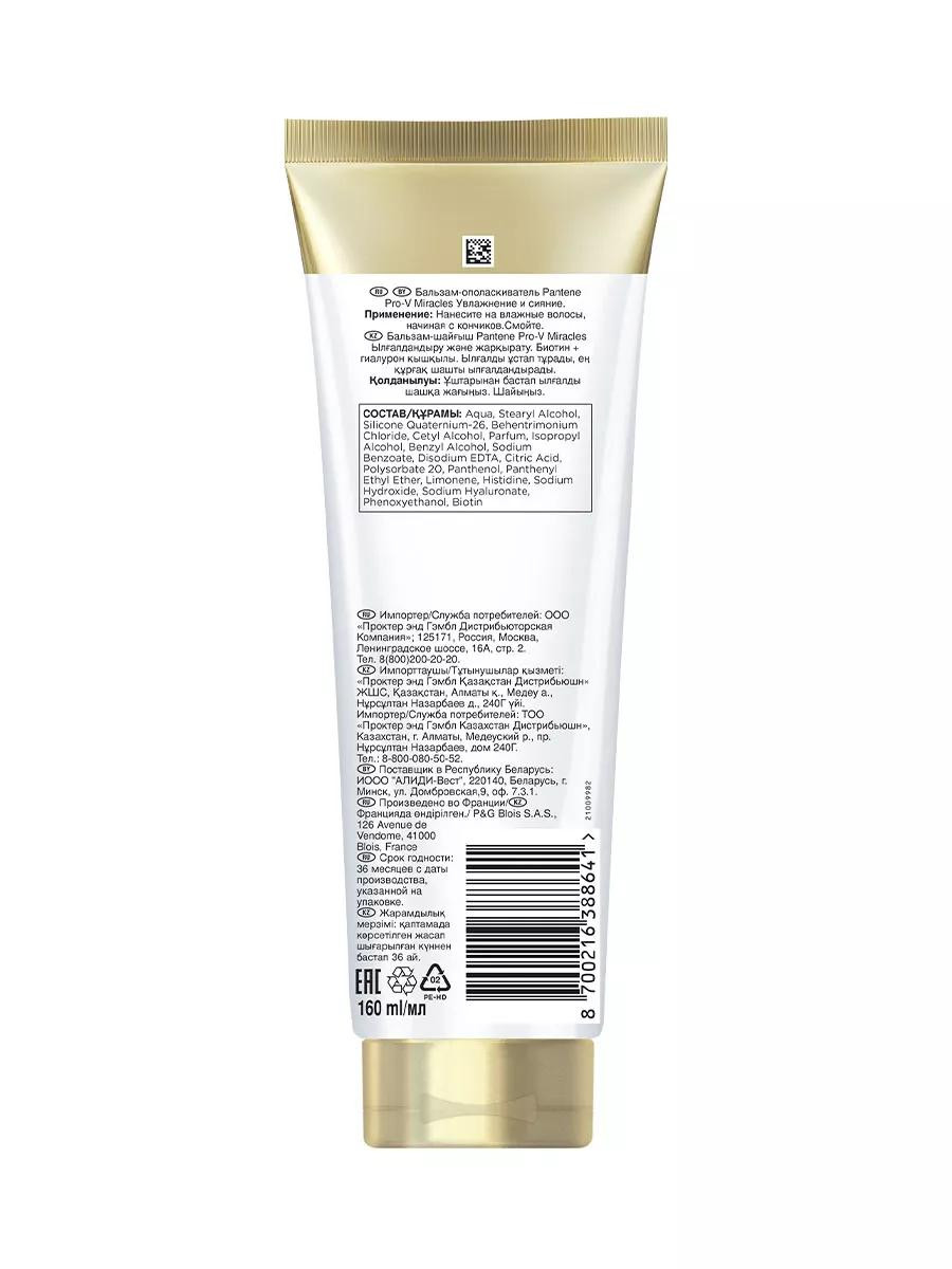 Бальзам-ополаскиватель Увлажнение и сияние от Pantene (Пантин) Pro-V Miracles— это уникальное увлажняющее средство для волос. Результат сопоставим с использованием профессионального бальзама-ополаскивателя. Его формула, обогащенная комплексом Pro-V, глубоко увлажняет склонные к сухости, тусклые волосы, придавая им исключительную мягкость и здоровый блеск. Бальзам для волос с гиалуроновой кислотой и биотином ежедневно ухаживает за волосами, обеспечивая им необходимое питание, чтобы они выглядели здоровыми, полными жизни и энергии. Откройте полную гамму средств Pro-V Miracles Увлажнение и Сияние для обеспечения эффекта, сопоставимого с профессиональным уходом, включая шампунь и маску, и наслаждайтесь идеально ухоженными волосами каждый день. Позаботьтесь о своих волосах как профессионал с Pantene!