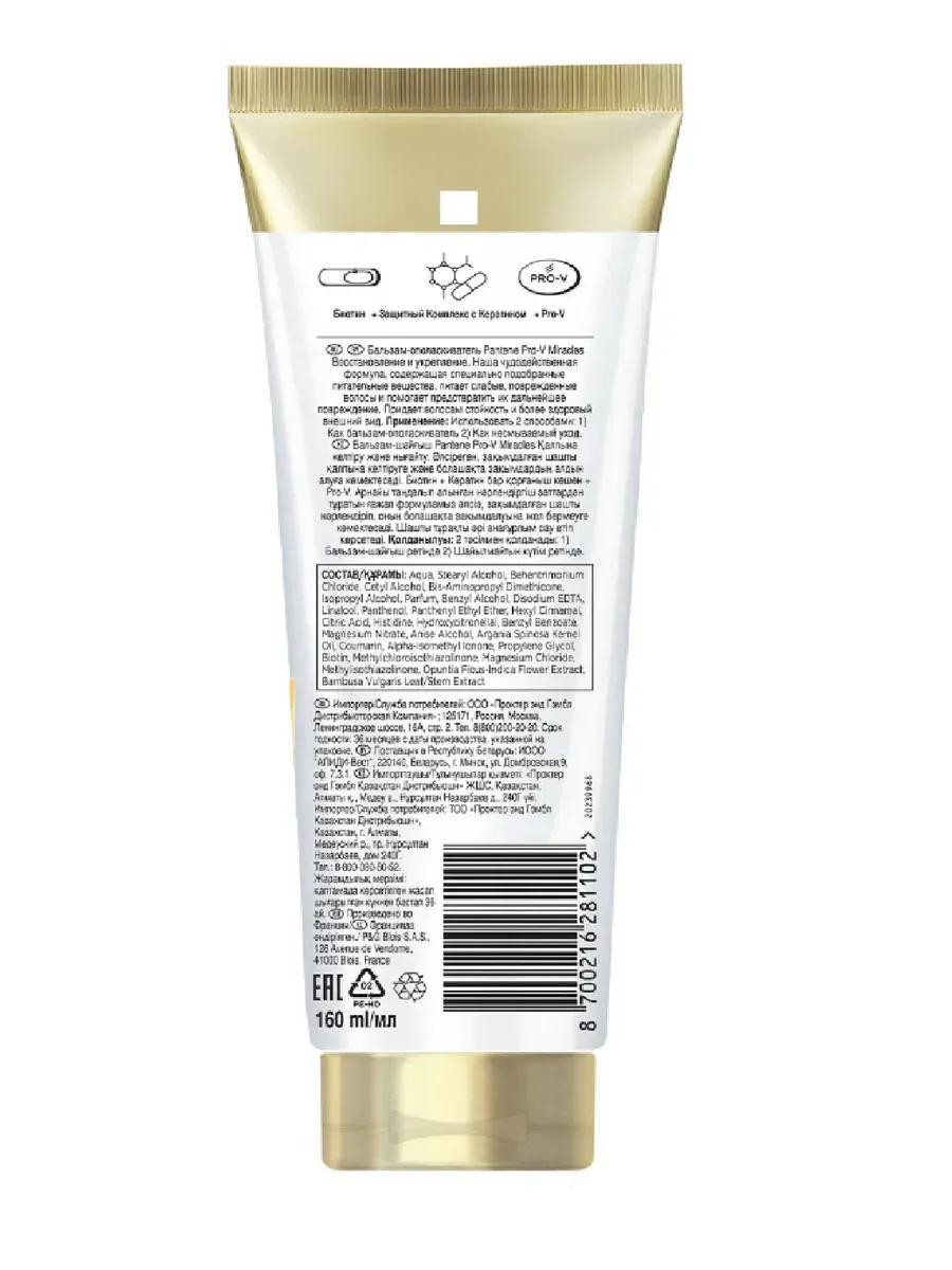 Pantene, Бальзам-ополаскиватель Pro-V Miracles Восстановление и укрепление, 160мл, 1 шт. Его экспертная формула с биотином, кератиновым комплексом и питательной смесью Pro-V глубоко питает сухие, поврежденные волосы и восстанавливает баланс влаги, чтобы они оставались послушными в течение всего дня. Бальзам-ополаскиватель также подходит для вьющихся волос. При использовании его в комплексе с другими средствами для ухода за волосами он помогает создать идеально гладкие локоны и красивые волны. Сохраняйте идеальную укладку в течение всего дня с гаммой средств Восстановление и укрепление. В нее входят шампунь, бальзам-ополаскиватель, маска и сыворотка мгновенного действия для укрощения непослушных волос.
