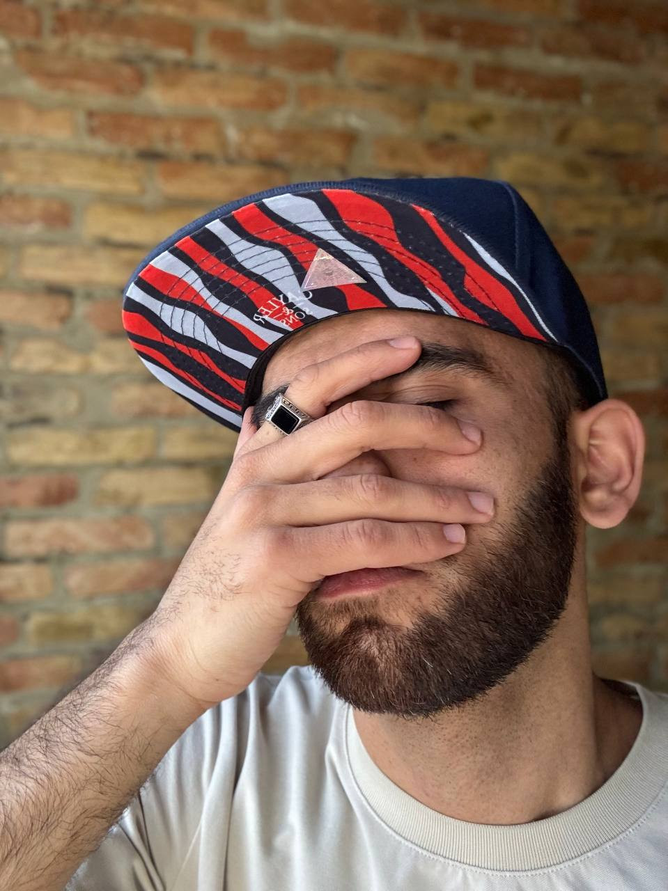 - Контрастный козырек: Нижняя сторона козырька имеет дерзкий узор из красных, белых и синих полос, что добавляет оригинальности.