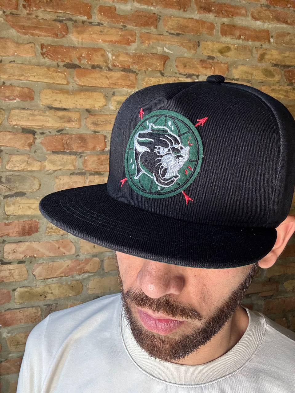 Эта стильная бейсболка Snapback с эффектной нашивкой "Пантера" станет ярким акцентом в вашем повседневном образе! Выполненная в классическом черном цвете, она универсальна и легко сочетается с различной одеждой. Главная изюминка кепки — круглая нашивка с изображением головы пантеры в зеленом круге, дополненная красными стрелками, напоминающими компас.