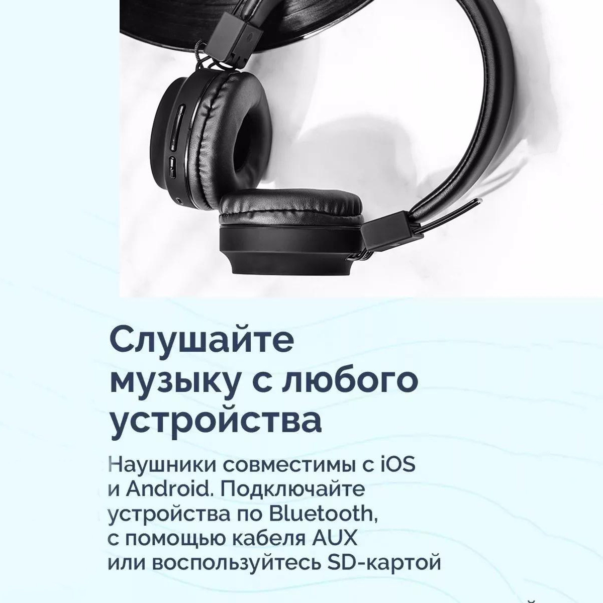 Накладные беспроводные стереонаушники с микрофоном. Подключение к смартфону осуществляется через Bluetooth соединение. Стильный внешний вид подчеркнёт индивидуальный характер владельца. Корпус устройства сделан из крепкого пластика, а амбушюры из экокожи. Накладная конструкция наушников и мощные драйвера с большим диапазоном частот позволят насладиться кристальным качеством звука. Источником звука для аксессуара может послужить как смартфон по проводной и беспроводной связи. Технические характеристики: Тип наушников - Накладные, встроенный микрофон Совместимость - IOS, Android Воспроизведение через Micro SD -Да Интерфейс - Bluetooth 5.0, Jack 3.5 мм, AUX, micro USB Питание - Аккумулятор Li-ion 260 мАч / 3,7 В Выходная мощность - 20 мВт Диапазон воспроизводимых частот - 20 - 20000 Гц Чувствительность - 90 дБ Импеданс - 32 Ом Материал - пластик, эко-кожа Размер - 186х180х75 мм
