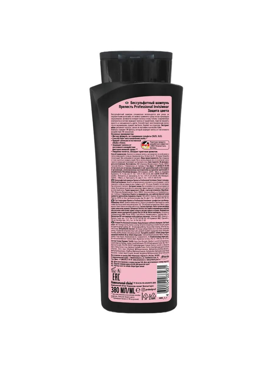 Прелесть Professional Invisiwear, шампунь Защита цвета, бессульфатный, 380 мл. Бессульфатный шампунь специально используется для ухода за окрашенными волосами, его можно применять сразу после процедуры окрашивания. Деликатно очищает волосы и кожу головы. Современные компоненты в составе защищают волосы от выцветания, помогая продлить яркость и насыщенность цвета. Способствует восстановлению волос после окрашивания, придает им блеск, бережет их структуру. Экстракт меда увлажняет волосы, делая их мягкими и шелковистыми. Шампунь содержит УФ-фильтр, который защищает волосы от негативного воздействия УФ-излучения.