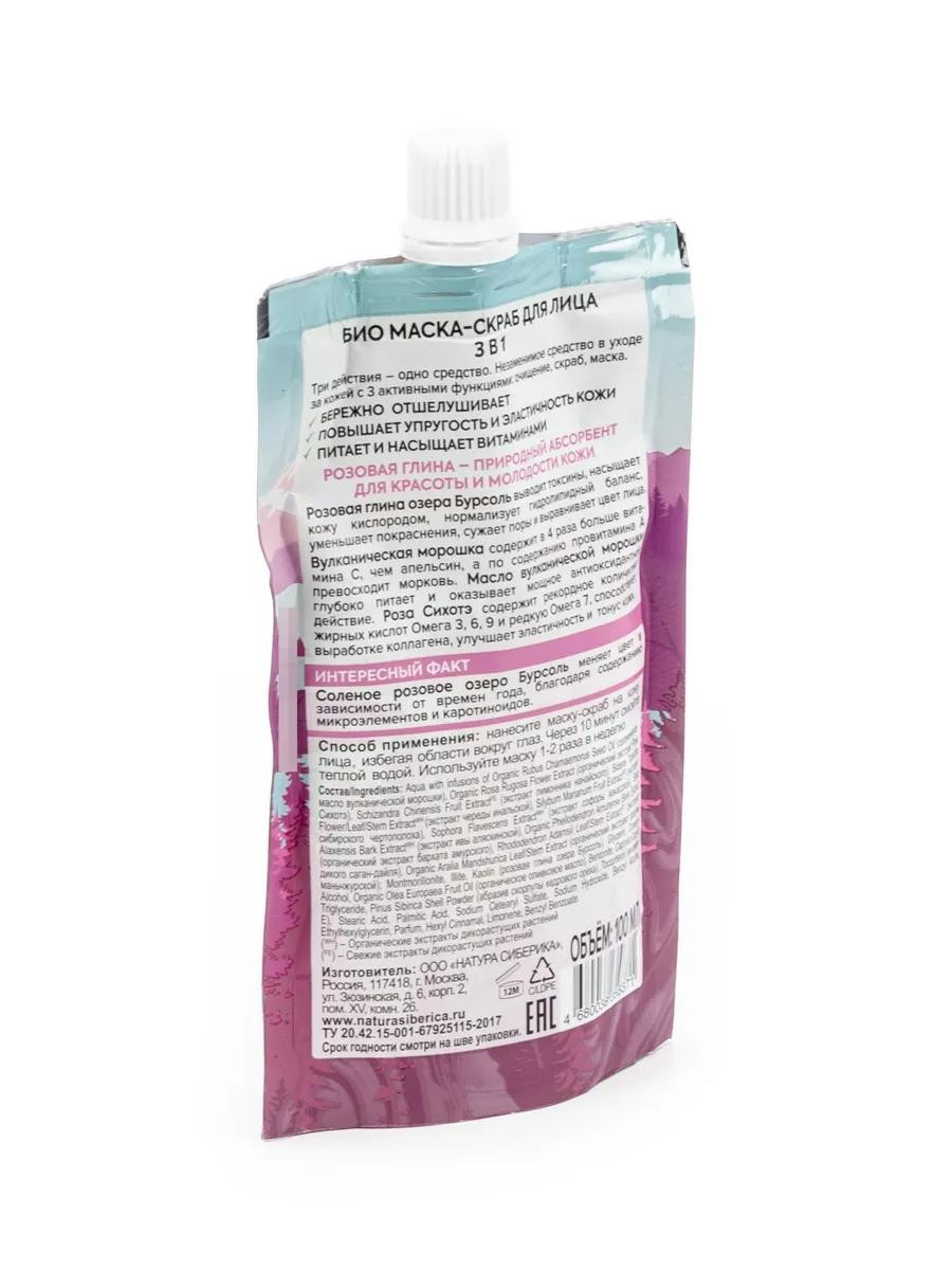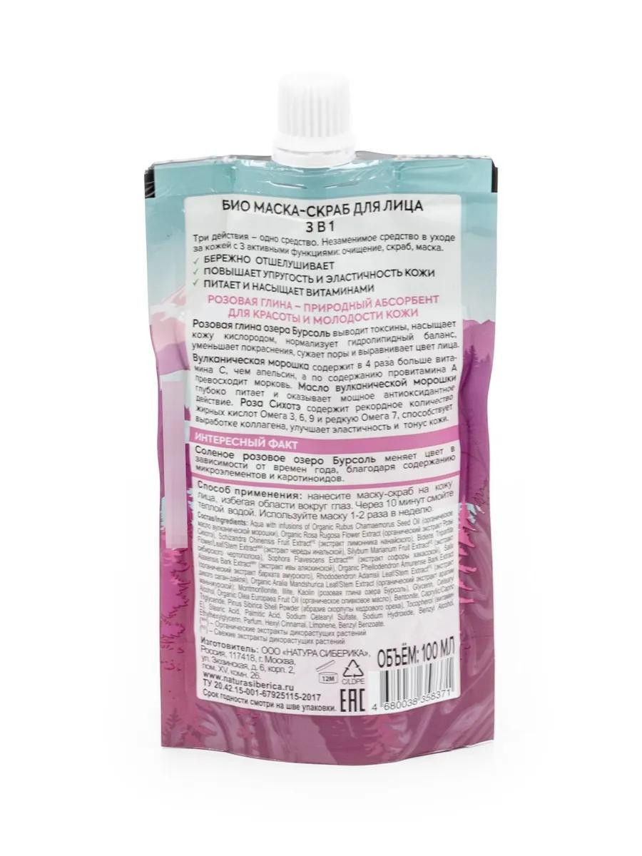 Natura Siberica / Натура Сиберика Био маска-скраб для лица Doctor Taiga Pink Volcano So Clean! 3 в 1 для всех типов кожи, на розовой глине 100мл / очищающее средство. Маски для лица необходимо использовать каждому, кто бережет свою кожу и хочет сохранить ее молодость и свежесть надолго. Био маска-скраб для лица Natura Siberica Doctor Taiga Pink Volcano So Clean! 3 в 1 на розовой глине это уникальное косметическое средство для базового ухода, которое завершает ритуал очищения. Содержание питательных веществ в составе маски обеспечивает комплексный уход и питание биологически активными компонентами. Микроэлементы обеспечивают многокомпонентный уход и улучшают обменные процессы на поверхности кожи. Главное действие маски: сглаживание различных кожных дефектов, очищение загрязненных пор. Три действия - одно средство. Незаменимое средство в уходе за кожей с 3 активными функциями: очищение, скраб, маска. - Бережно отшелушивает. - Повышает упругость и эластичность кожи. - Питает и насыщает витаминами. Розовая глина - природный абсорбент для красоты и молодости кожи. Розовая глина озера Бурсоль выводит токсины, насыщает кожу кислородом, нормализует гидролипидный баланс, уменьшает покраснения, сужает поры и выравнивает цвет лица. Вулканическая морошка содержит в 4 раза больше витамина С, чем апельсин, а по содержанию провитамина А превосходит морковь. Масло вулканической морошки глубоко питает и оказывает мощное антиоксидантное действие. Роза Сихотэ содержит рекордное количество жирных кислот Омега 3, 6, 9 и редкую Омега 7, способствует выработке коллагена, улучшает эластичность и тонус кожи. Интересный факт: соленое озеро Бурсоль меняет цвет в зависимости от времен года, благодаря содержанию микроэлементов и каротиноидов. Био маска-скраб для лица Natura Siberica Doctor Taiga Pink Volcano So Clean! 3 в 1 устранит следы преждевременного старения, разгладит мимические морщины, очистит и приведет в тонус вашу кожу!