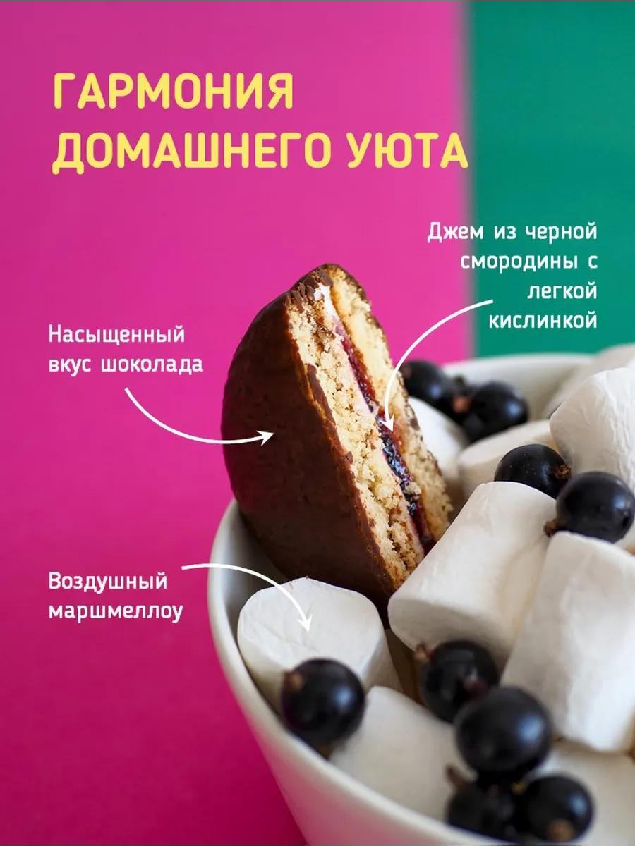 Воздушный бисквит, два слоя классического маршмеллоу и насыщенная начинка из чёрной смородины в тонком слое молочной шоколадной глазури. Яркий ягодный вкус и мягкая текстура создают идеальный порционный десерт.