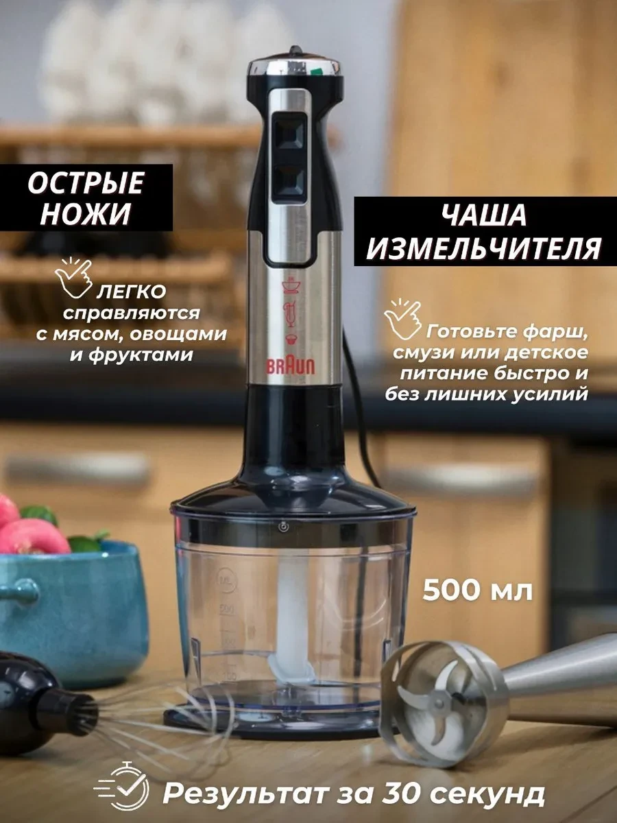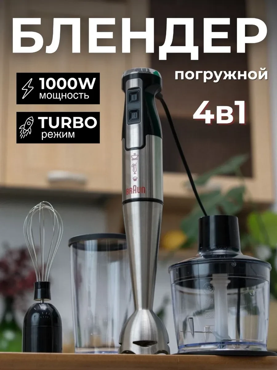 Мощный погружной блендер 4 в 1 Braun— это идеальный выбор для тех, кто ценит универсальность и качество на своей кухне. Благодаря высокой мощности и продуманному дизайну, этот блендер идеально справляется с приготовлением смузи, коктейлей, пюре, соусов и даже детского питания. В комплекте предусмотрены насадки для взбивания, измельчения и смешивания, что делает его незаменимым помощником в готовке.
