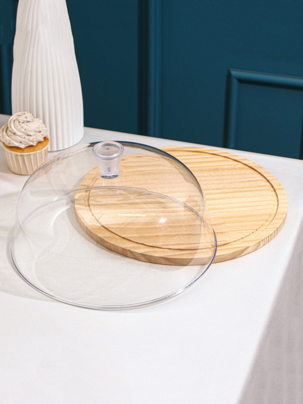 Круглое деревянное блюдо с прозрачной крышкой. Подходит для подачи и хранения тортов, пирогов, сыров и закусок. Натуральное дерево и купол из пластика защищают от пыли и сохраняют свежесть продуктов.