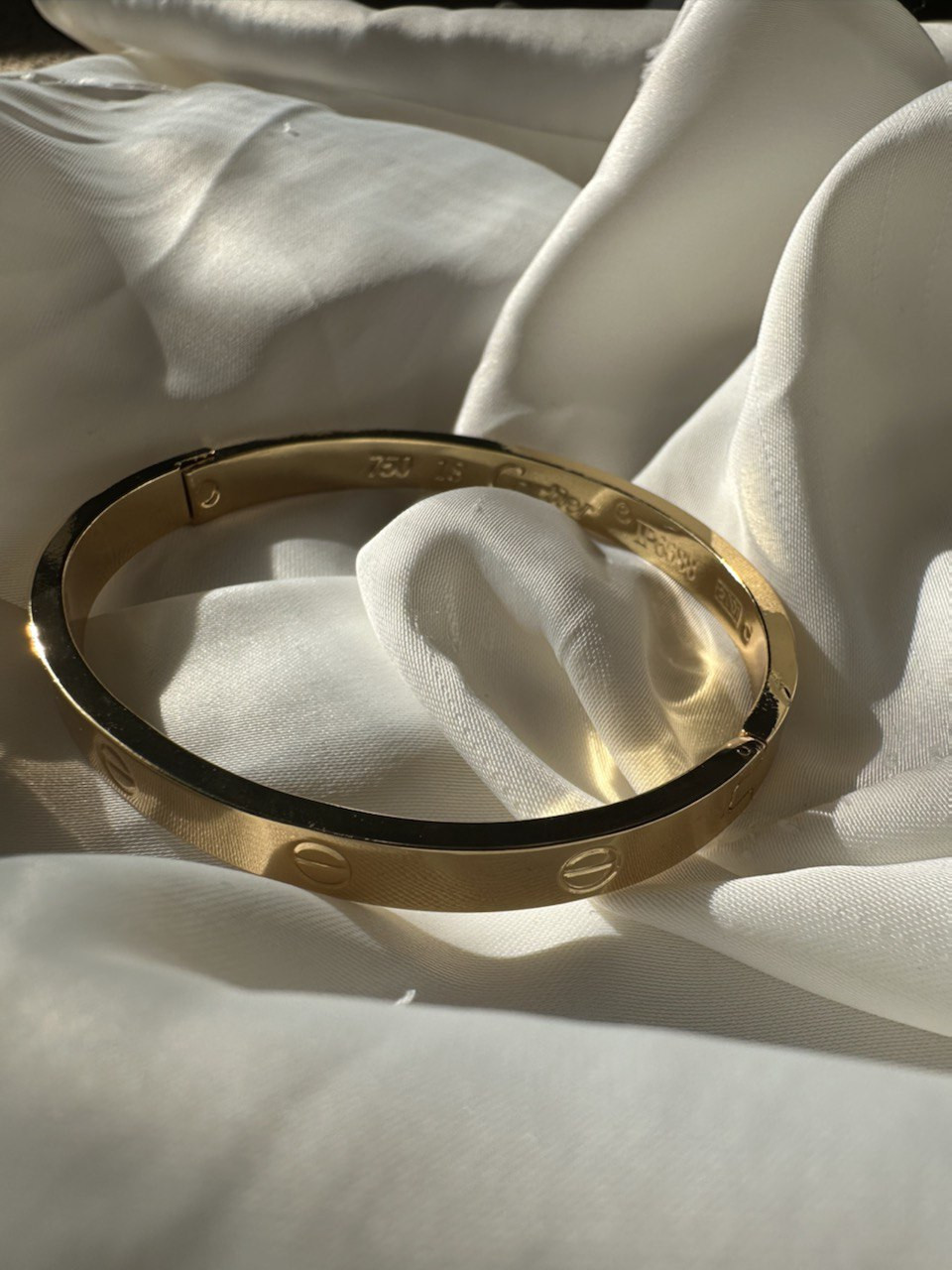 Лаконичный и элегантный браслет в золотистом цвете, украшенный характерными гравировками в виде символов "винтов". Этот аксессуар символизирует вечную любовь и утонченность. Подходит как для повседневного образа, так и для особых случаев, добавляя стильный акцент к вашему внешнему виду.