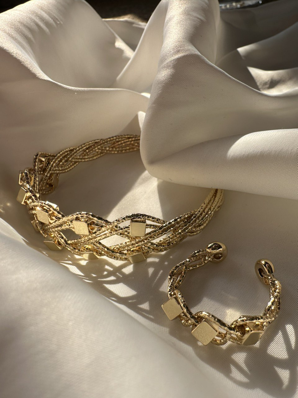 Элегантный комплект из браслета и кольца в золотистом цвете с плетеным дизайном и квадратными элементами. Идеально для повседневного образа или особых случаев.