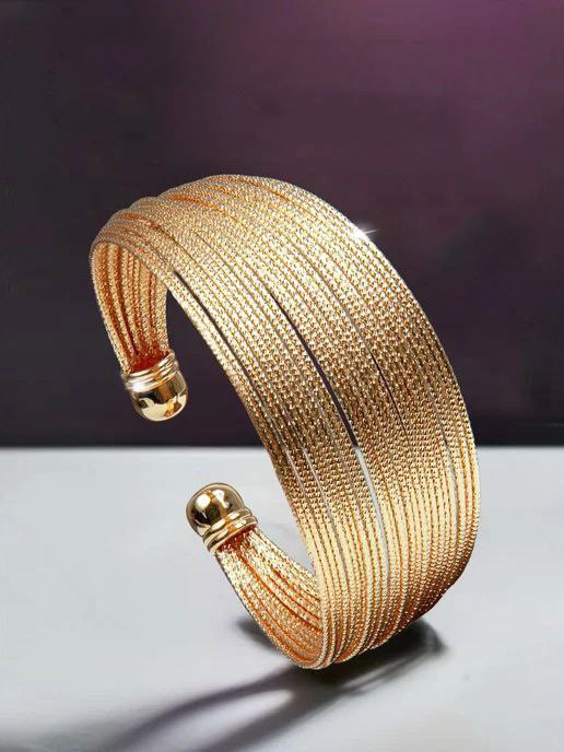 ✨ Браслет – широкий, но изящный браслет с открытой конструкцией, состоящий из множества тонких металлических нитей, создающих эффект легкости и воздушности. Украшен гладкими закругленными наконечниками для комфортной посадки на запястье.
