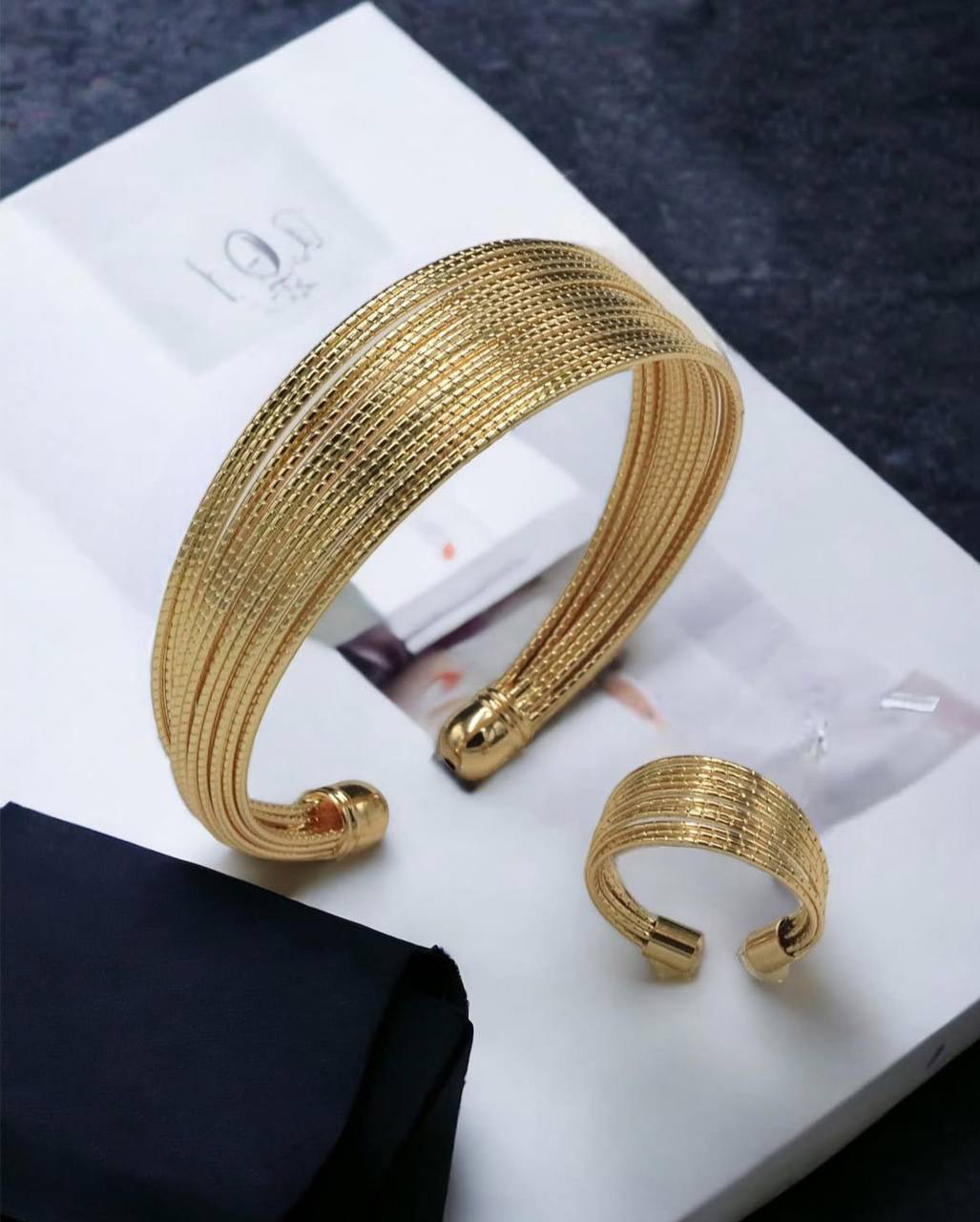 Этот стильный комплект украшений включает многослойный браслет и кольцо, выполненные в дизайне "струны", что придает аксессуарам элегантность и современный вид.