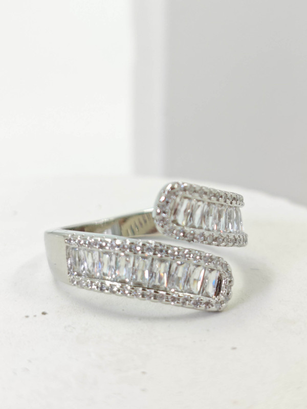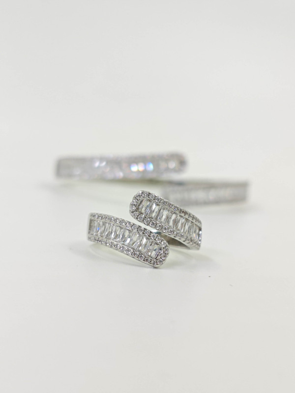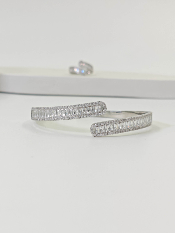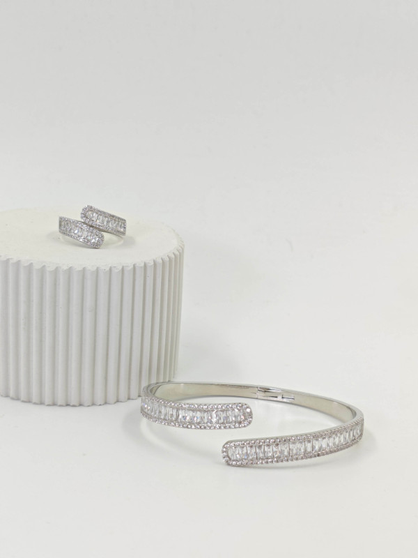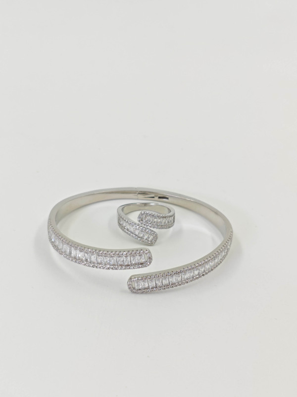 Этот роскошный комплект, выполненный под серебро, включает браслет и кольцо, инкрустированные сверкающими камнями, что придает украшениям элегантность и утонченность.