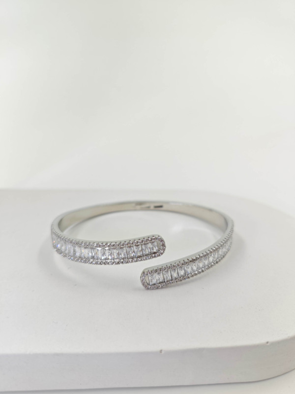 ? Браслет: Открытая конструкция с инкрустацией прямоугольными фианитами, создающими эффект бриллиантового блеска. Дополнительная дорожка мелких камней по краям придает изделию еще больше изысканности.