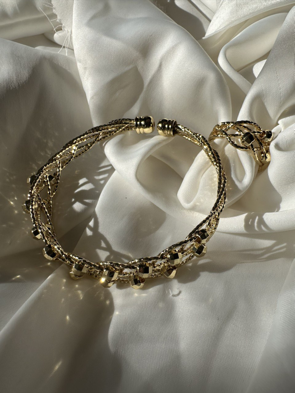 Элегантный браслет с плетением и декоративными бусинами. Выполнен из качественного металла в золотистом цвете, подойдет для повседневного или вечернего образа. Легкий, удобный и стильный аксессуар для любого случая.