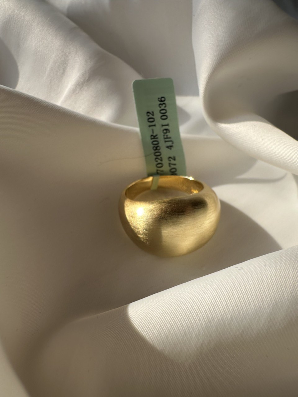 Утончённое кольцо минималистичного дизайна с матовой текстурой. Обтекаемая форма и аккуратные линии делают его универсальным аксессуаром, который подходит для любого стиля. Кольцо выполнено из металла в золотистом цвете, что добавляет ему элегантности и мягкого блеска.