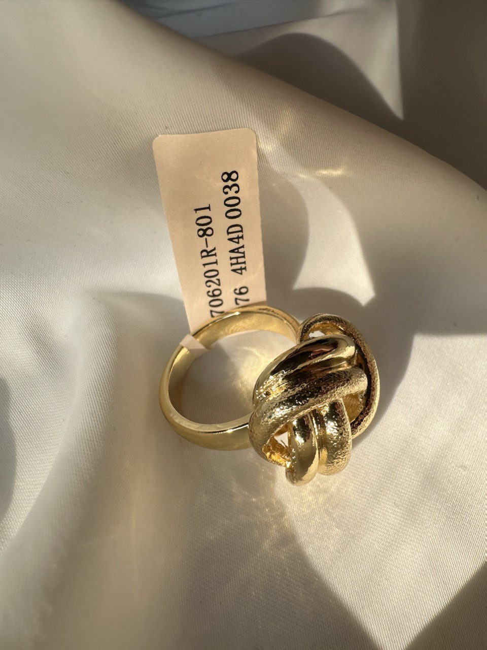 Утончённое кольцо с оригинальным дизайном в виде узла. Комбинация гладких и текстурированных элементов придаёт изделию уникальный и современный вид. Золотистый цвет добавляет кольцу элегантности, делая его подходящим как для повседневного ношения, так и для особых случаев.