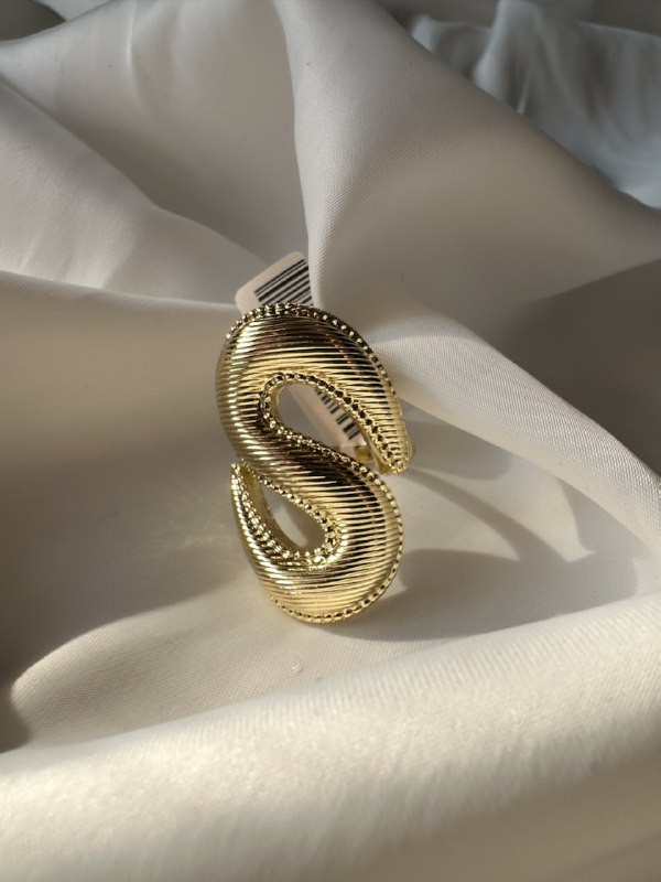 Эффектное кольцо с изысканным дизайном в форме элегантного завитка. Тонкая рифленая текстура поверхности и блестящий золотистый цвет придают изделию стильный и современный вид. Это украшение подчеркнет вашу индивидуальность и станет акцентным аксессуаром.